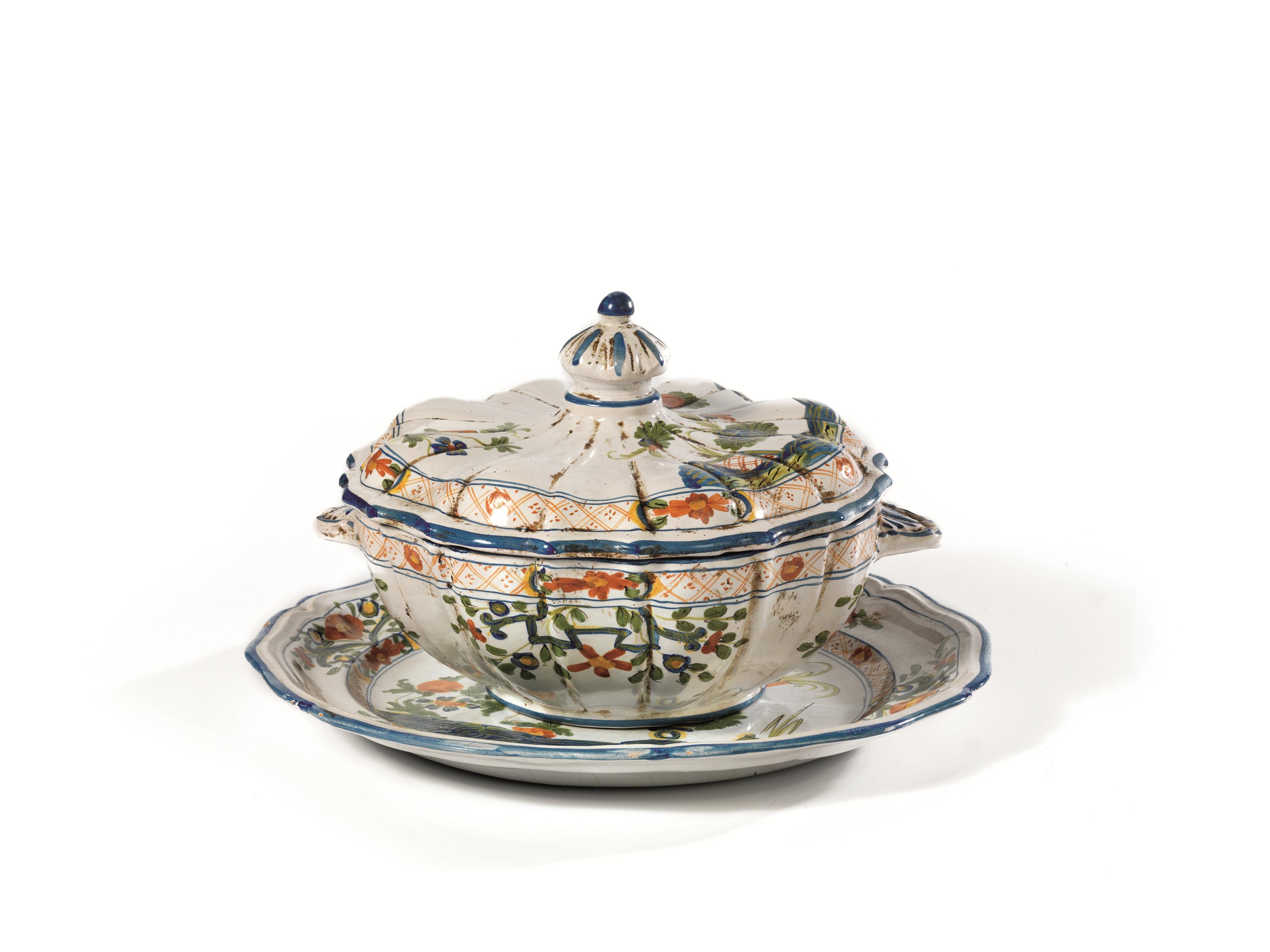 Lotto 369 | Piccola zuppiera, Faenza, sec. XX, coperchio con baccellatura, bordo...