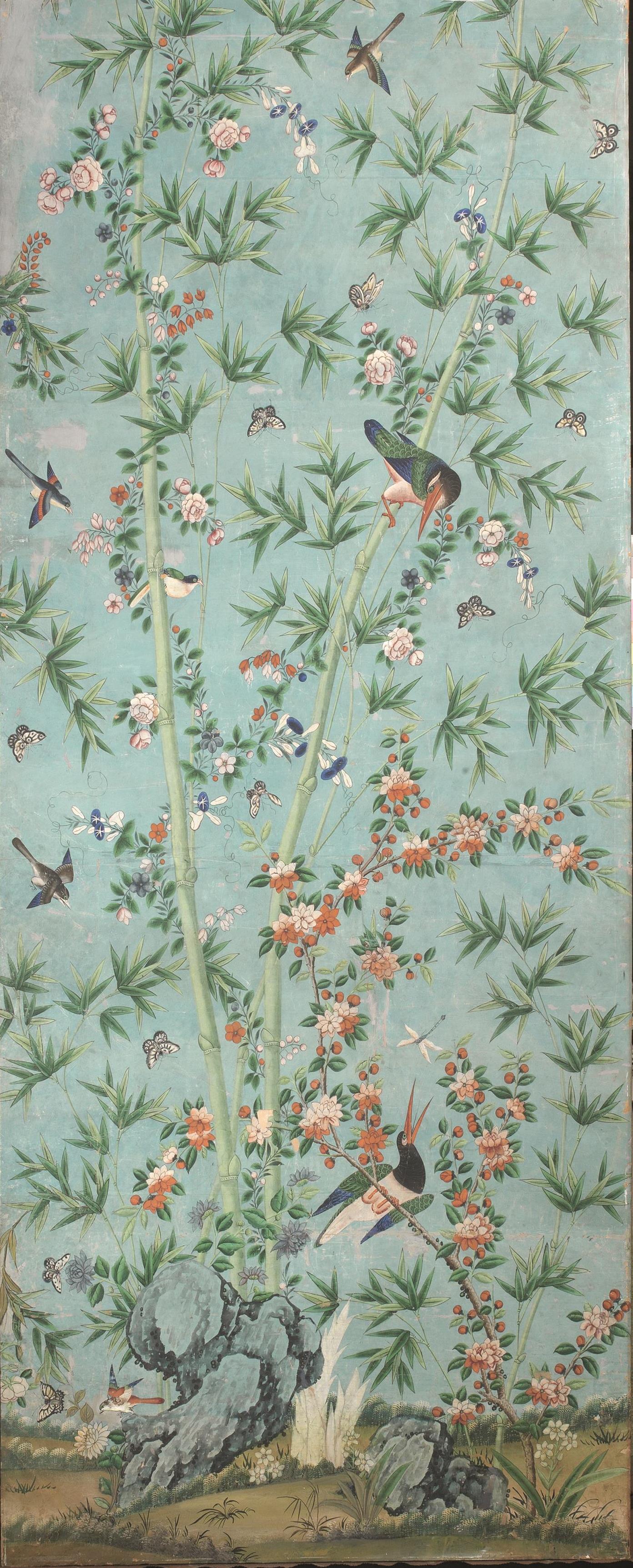 Tre grandi papier peints, Piemonte, sec. XVIII, dipinti con alberi e volatili...
