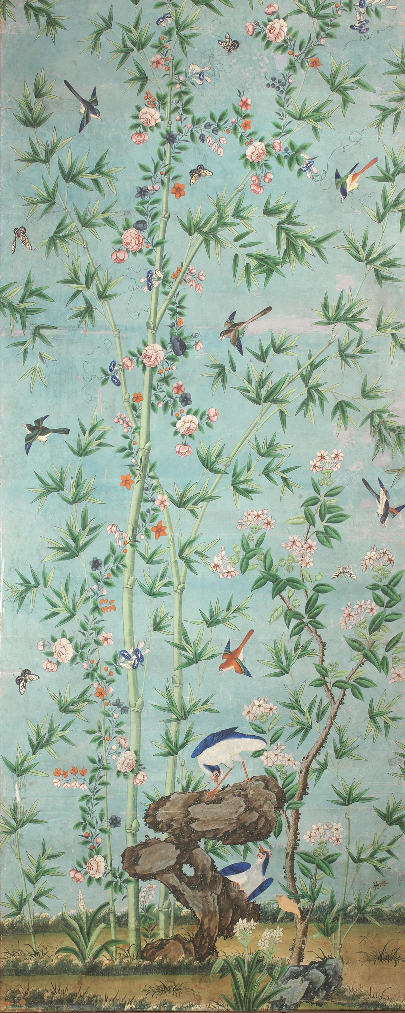 Tre grandi papier peints, Piemonte, sec. XVIII, dipinti con alberi e volatili di gusto cinese su fondo avorio, entro cornice lignea, cm 204x127, cm 216x125, cm 237x180, danni (3)