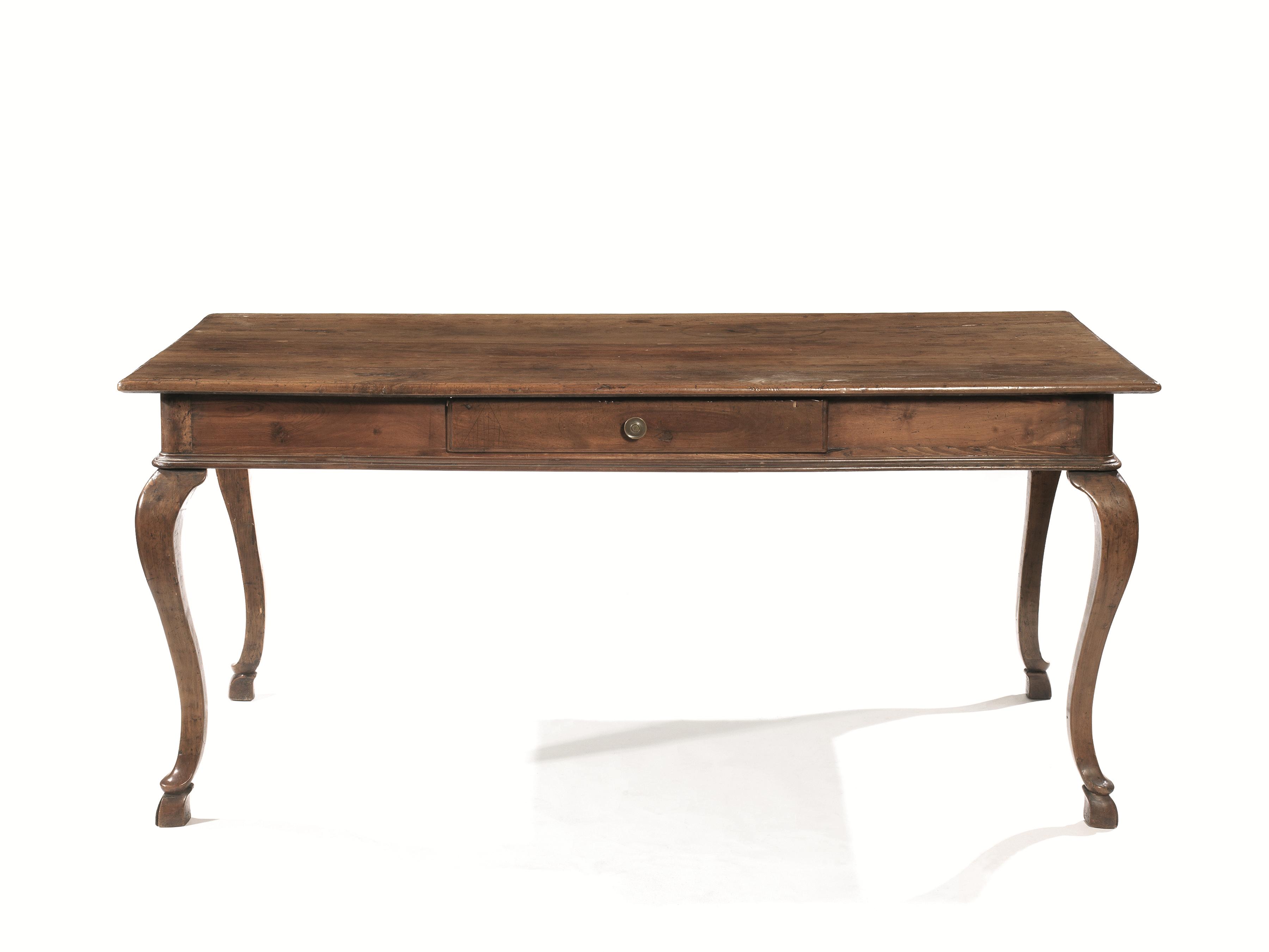 Tavolo da studio, Toscana, seconda metà sec. XVIII, in noce a patina bionda, piano rettangolare con becco di civetta, un cassetto nella fascia, alte gambe mosse su piede a zoccolo equino, cm 175x89x78