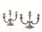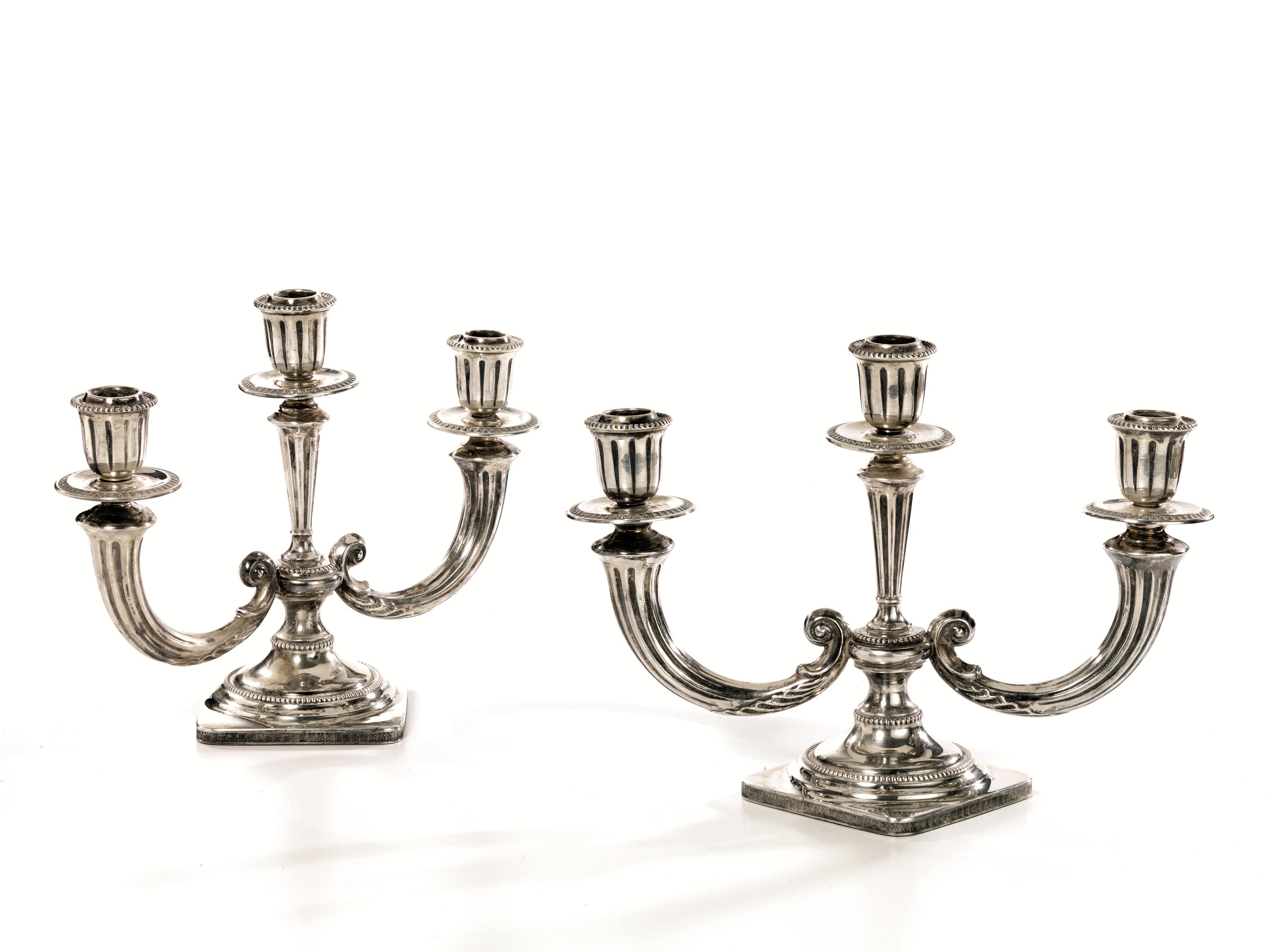 Coppia di candelabri, in argento, ciascuno a due bracci per complessive tre luci, bordi decorati a cordonetto e piccole foglie, alt. cm 23, g 1230 (2)