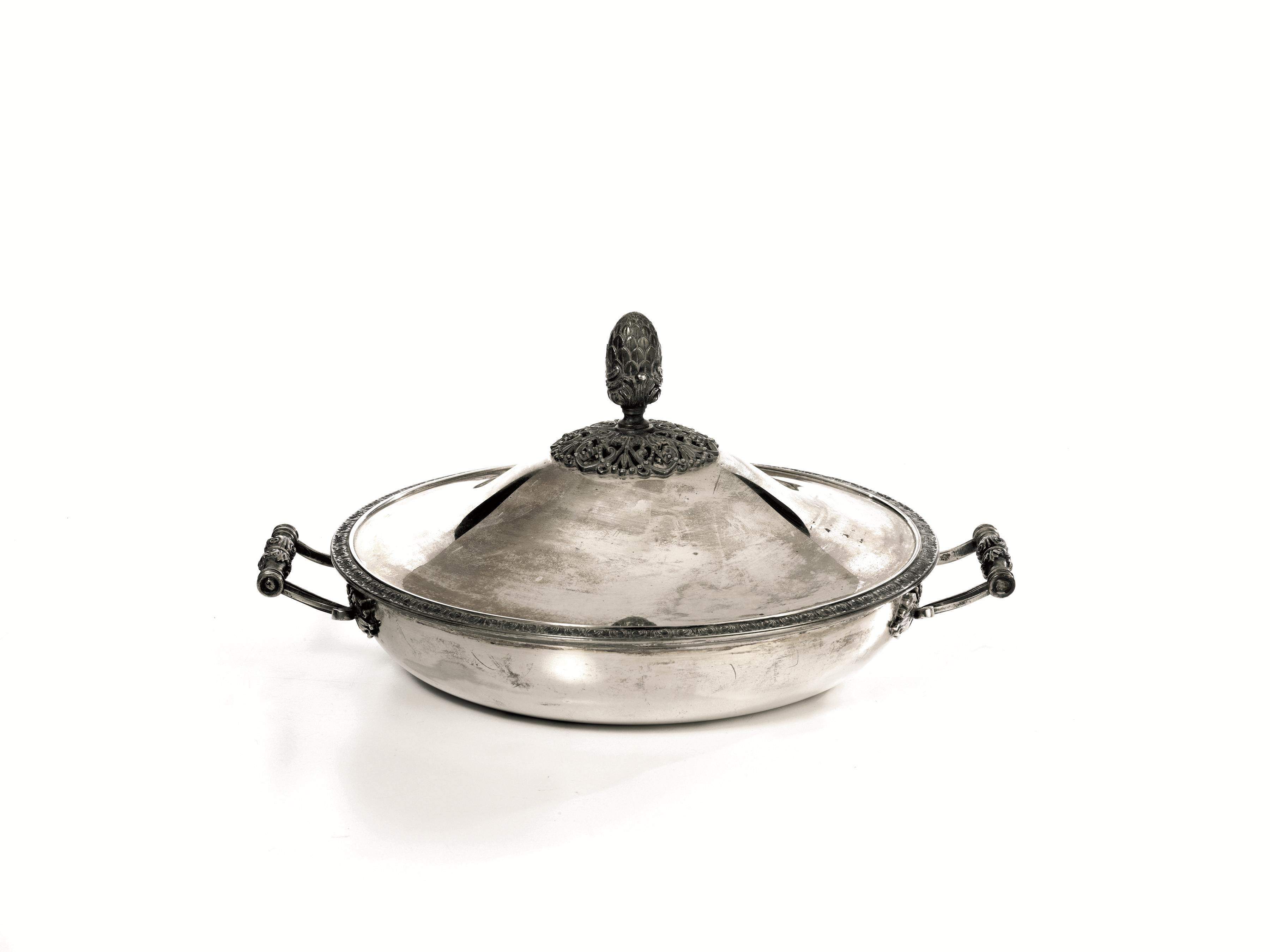 Legumiera, di forma circolare in argento, a due manici e coperchio con presa a forma di pigna, g 1065