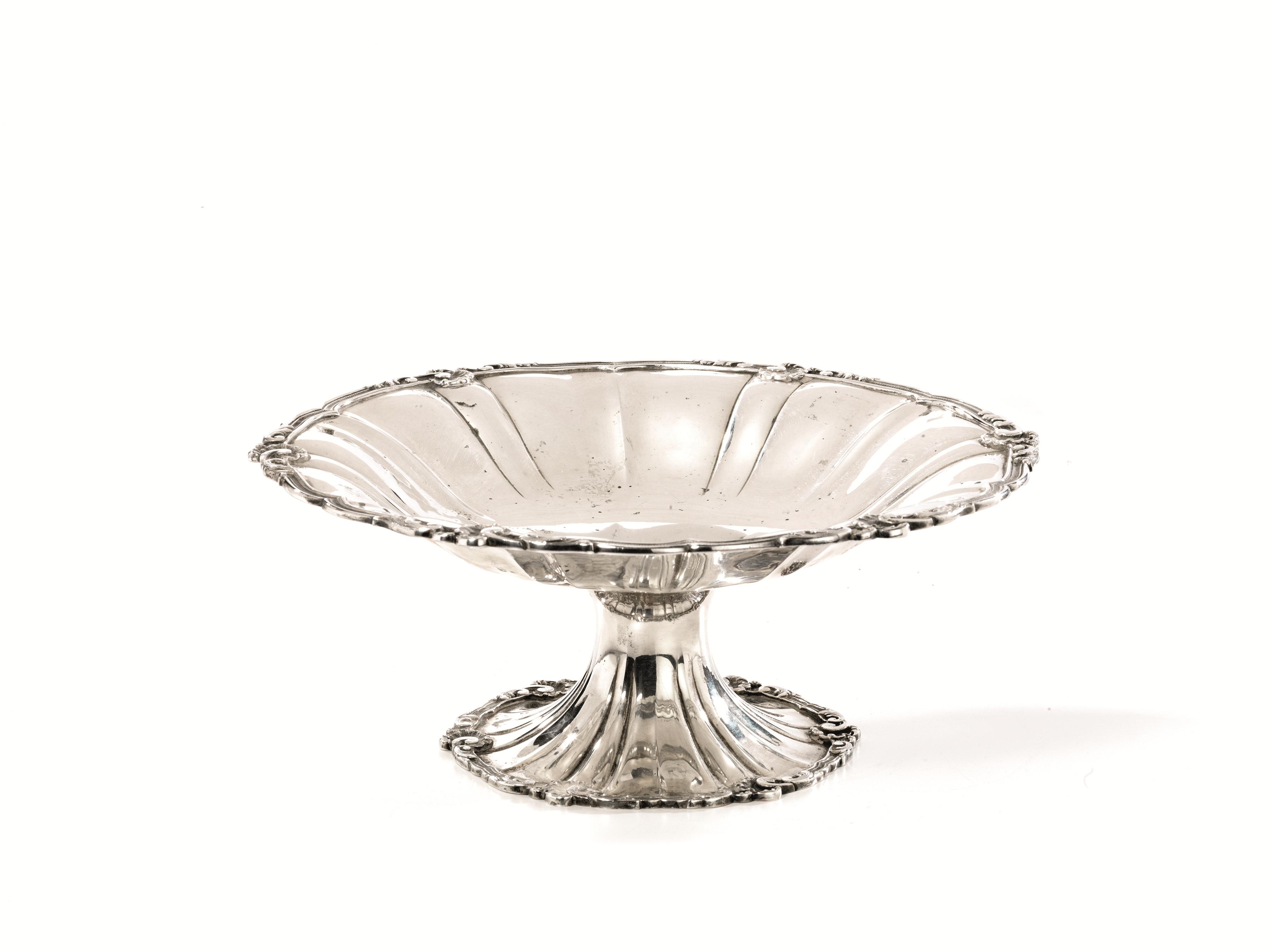 Fruttiera, in argento, bordo smerlato e decorato a motivi vegetali, su piede circolare ornato in modo analogo, diam cm 29, gr. 1030