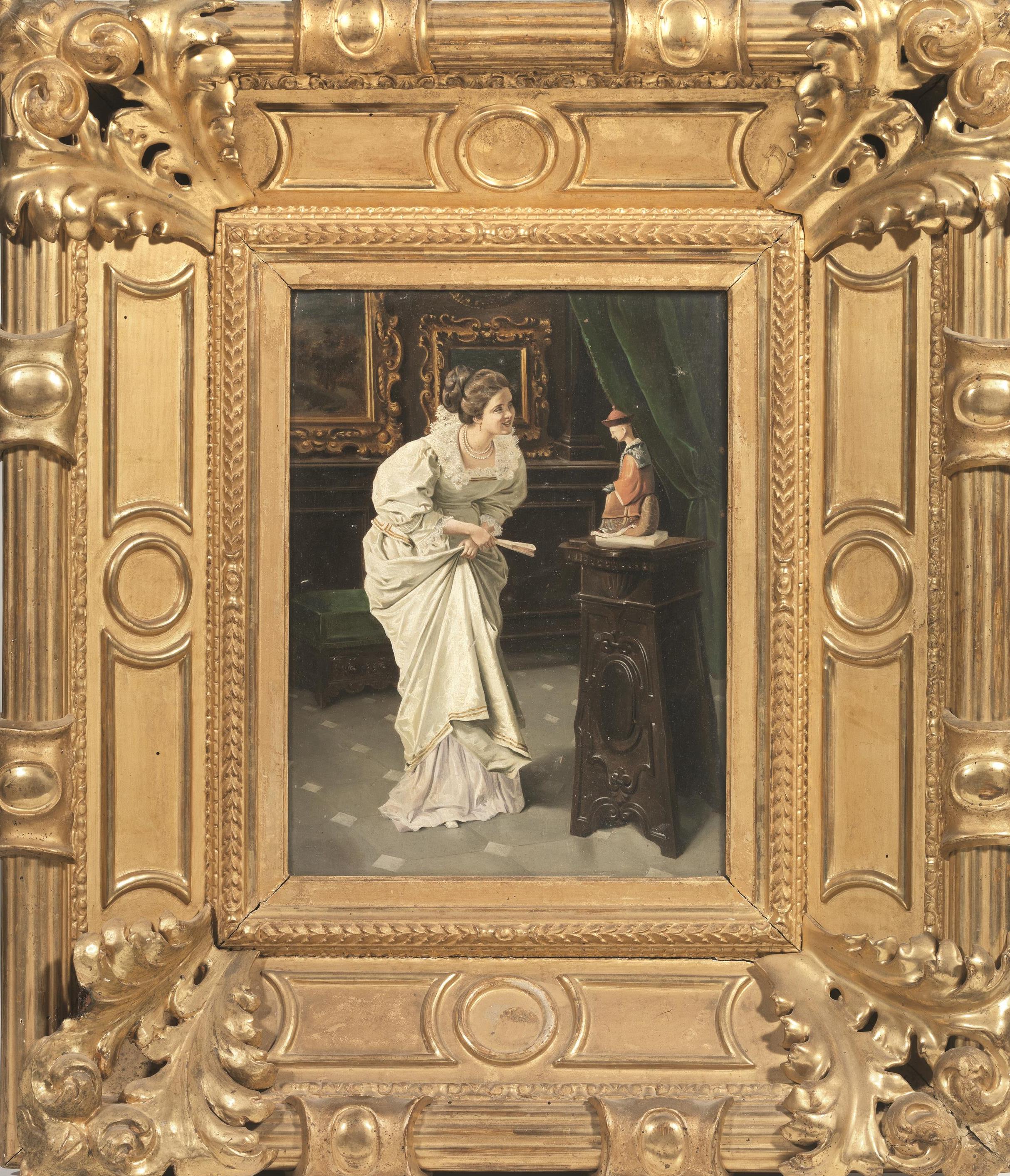 Scuola del sec. XIX GENTILDONNA CON STATUA CINESE e GENTILUOMO DAVANTI A UN...