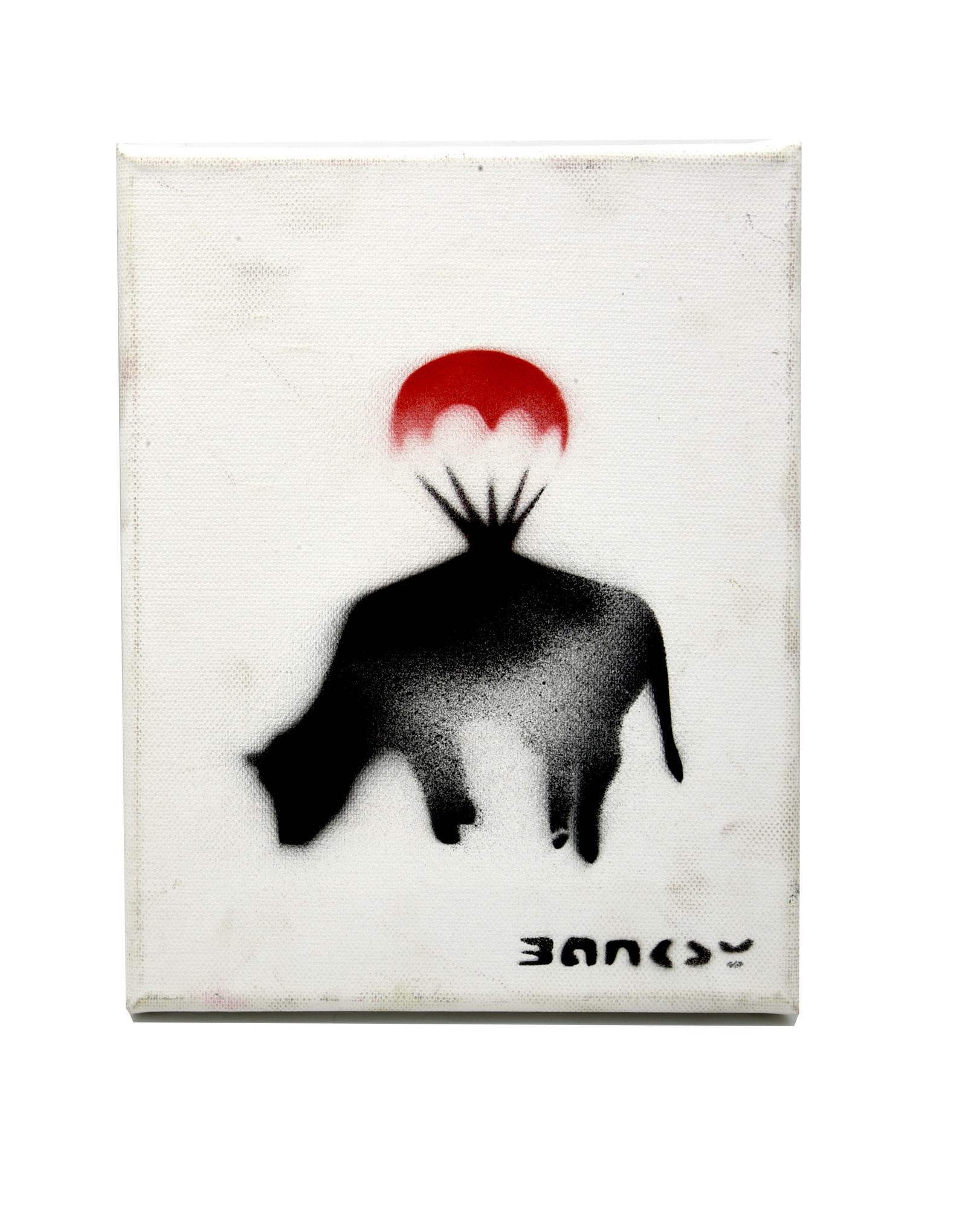 Banksy COW PARACHUTE sprayed stencil graffiti su tela, cm 24x19; es. 3/10 sul...