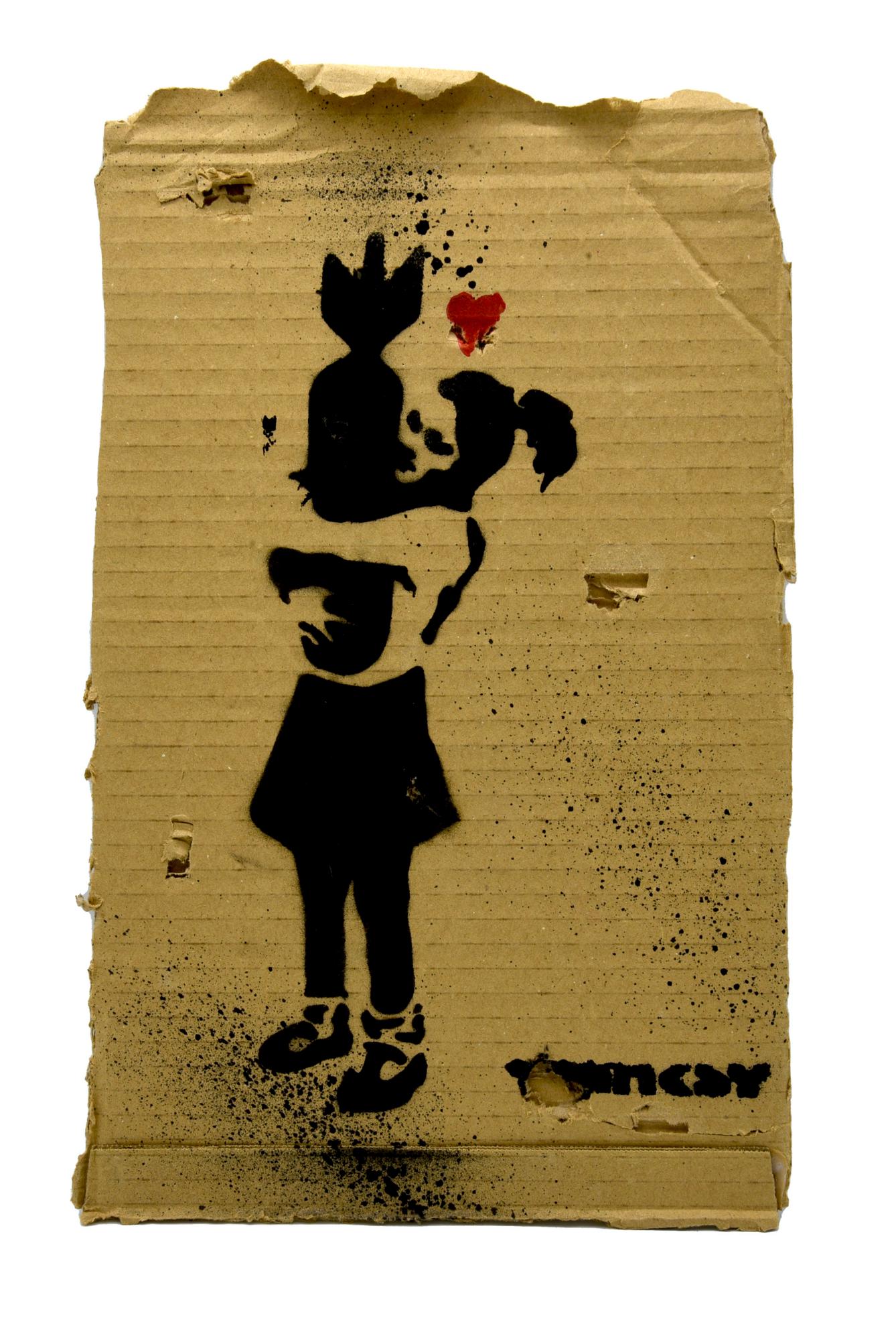 Banksy BOMB HUGGER sprayed stencil graffiti su cartone, cm 36,5x22 sul retro:...