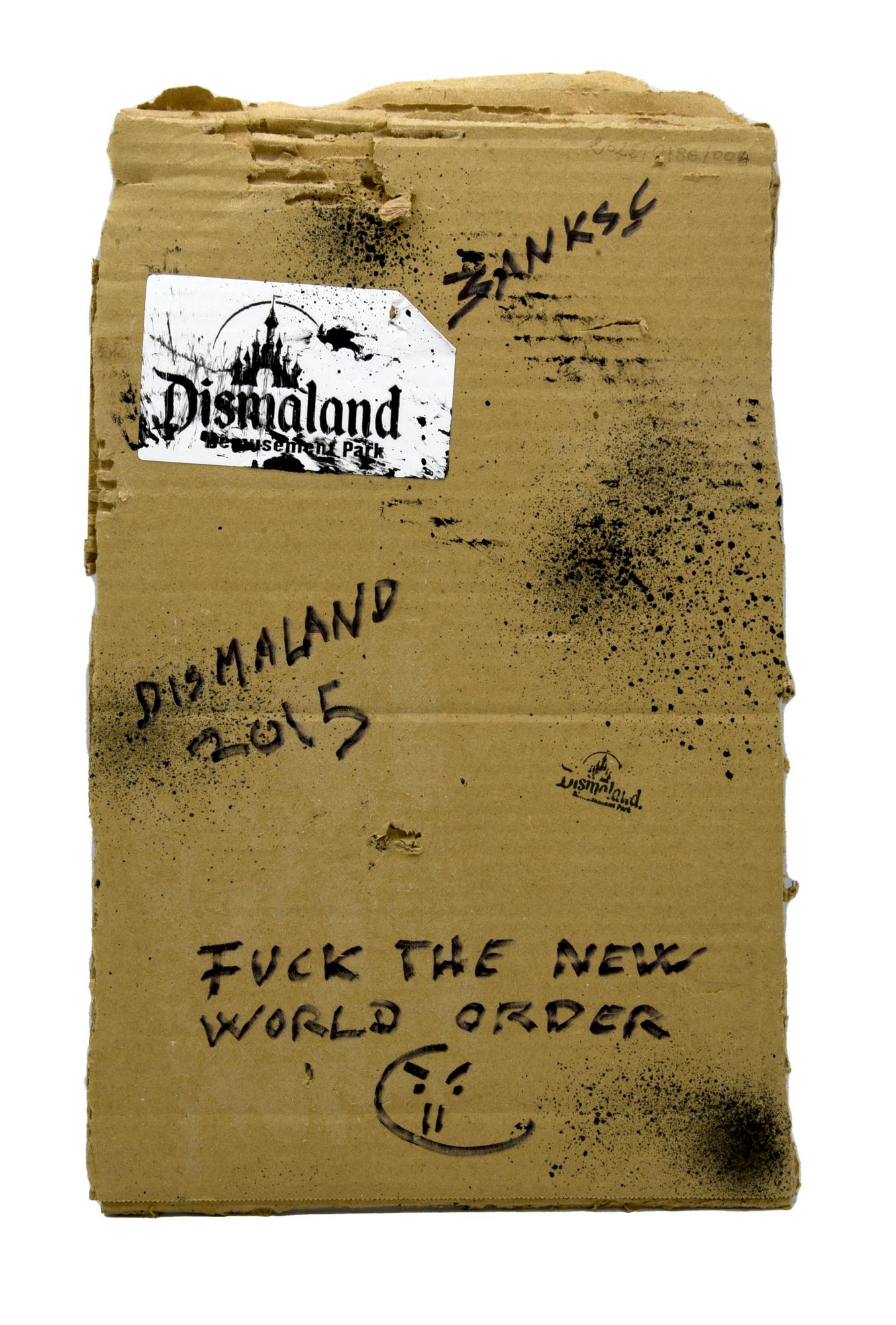sul retro: timbro Dismaland ed iscritto "fuck the new world order"