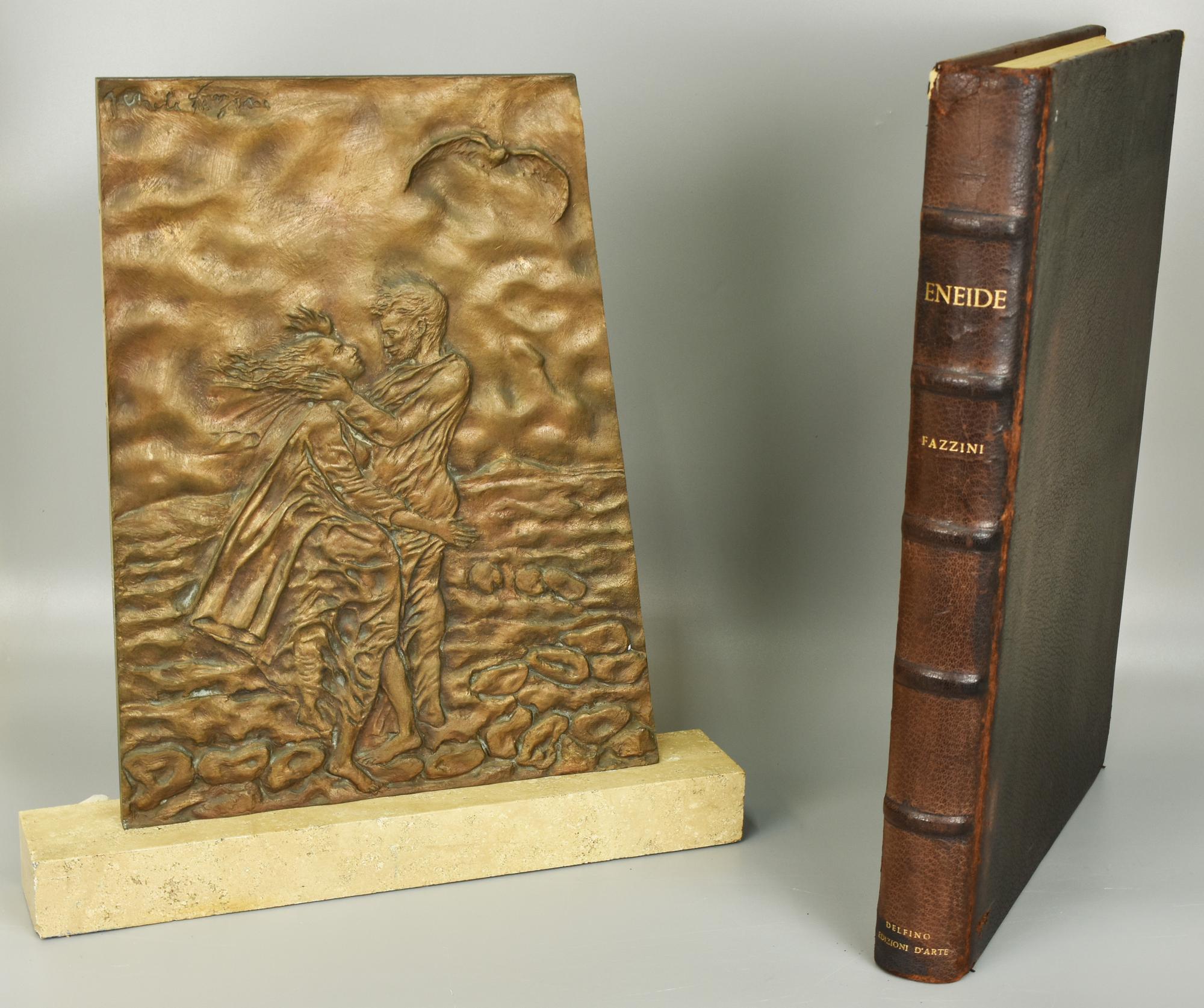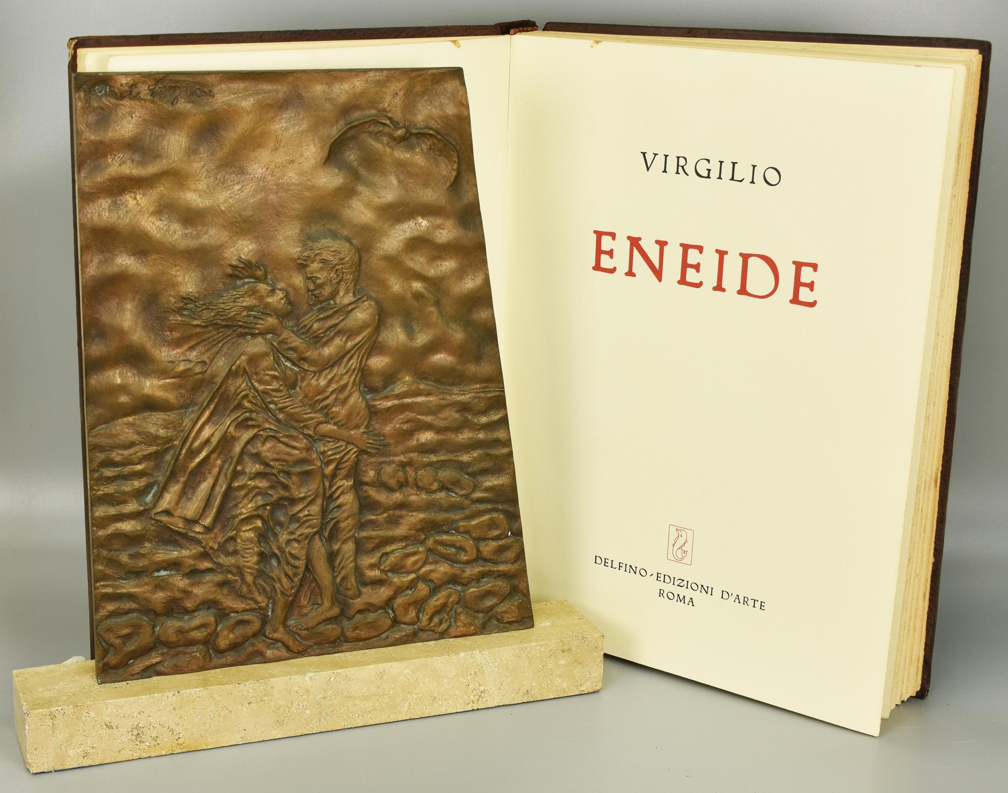 Il volume e' accompagnato da un bassorilievo in bronzo fuso poggiante su piedistallo di travertino romano, raffigurante Didone ed Enea, e recante firma incisa al fronte