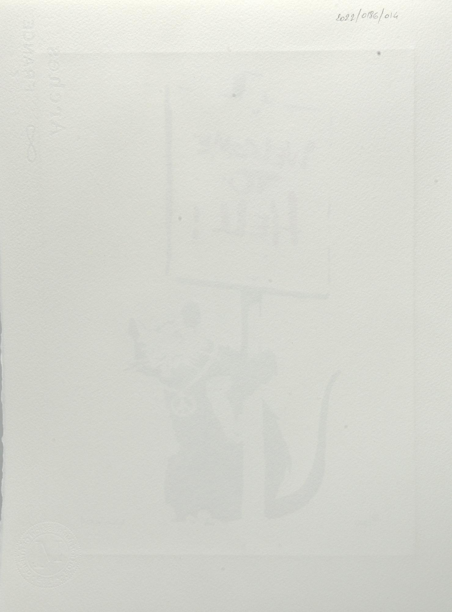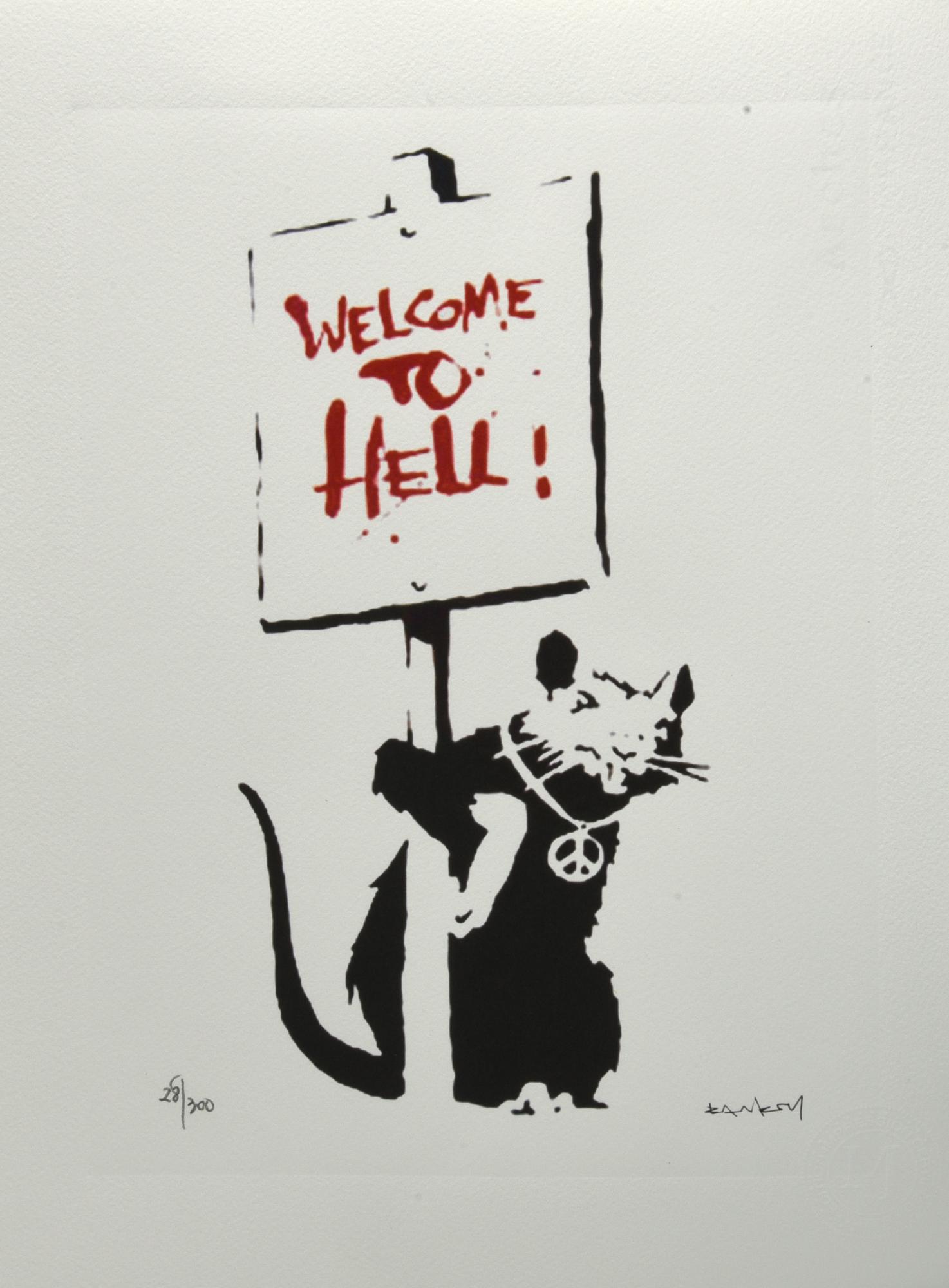 Da Banksy WELCOME TO HELL eliografia su carta Arches, cm 38,5x28,5; es....