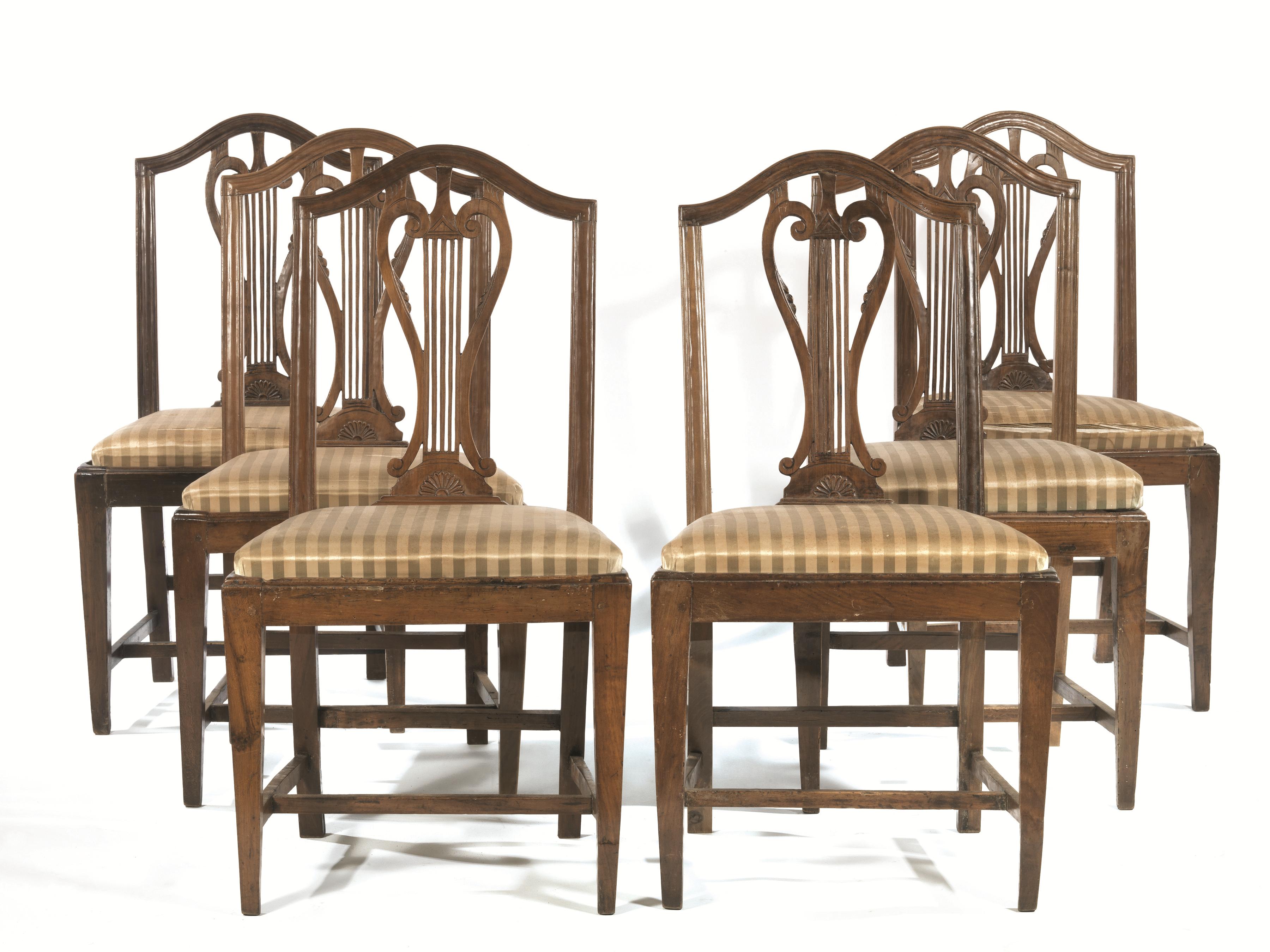 Sei sedie, Toscana, fine sec. XVIII, in ciliegio tinto a noce, spalliera sagomata centrata da cartella traforata a lira, gambe troncopiramidali riunite da traversa ad H, alcuni danni e restauri