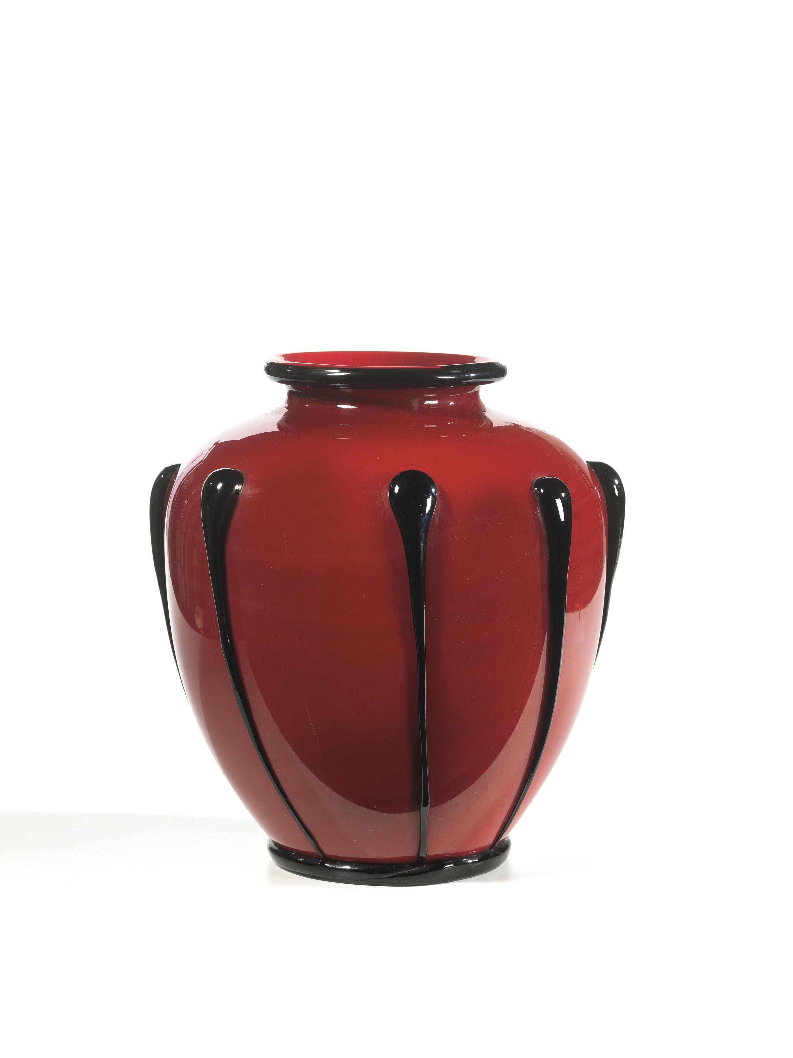 Vaso in vetro, Murano, di forma globulare con costolonature in rilievo nere, alt. cm 32