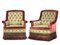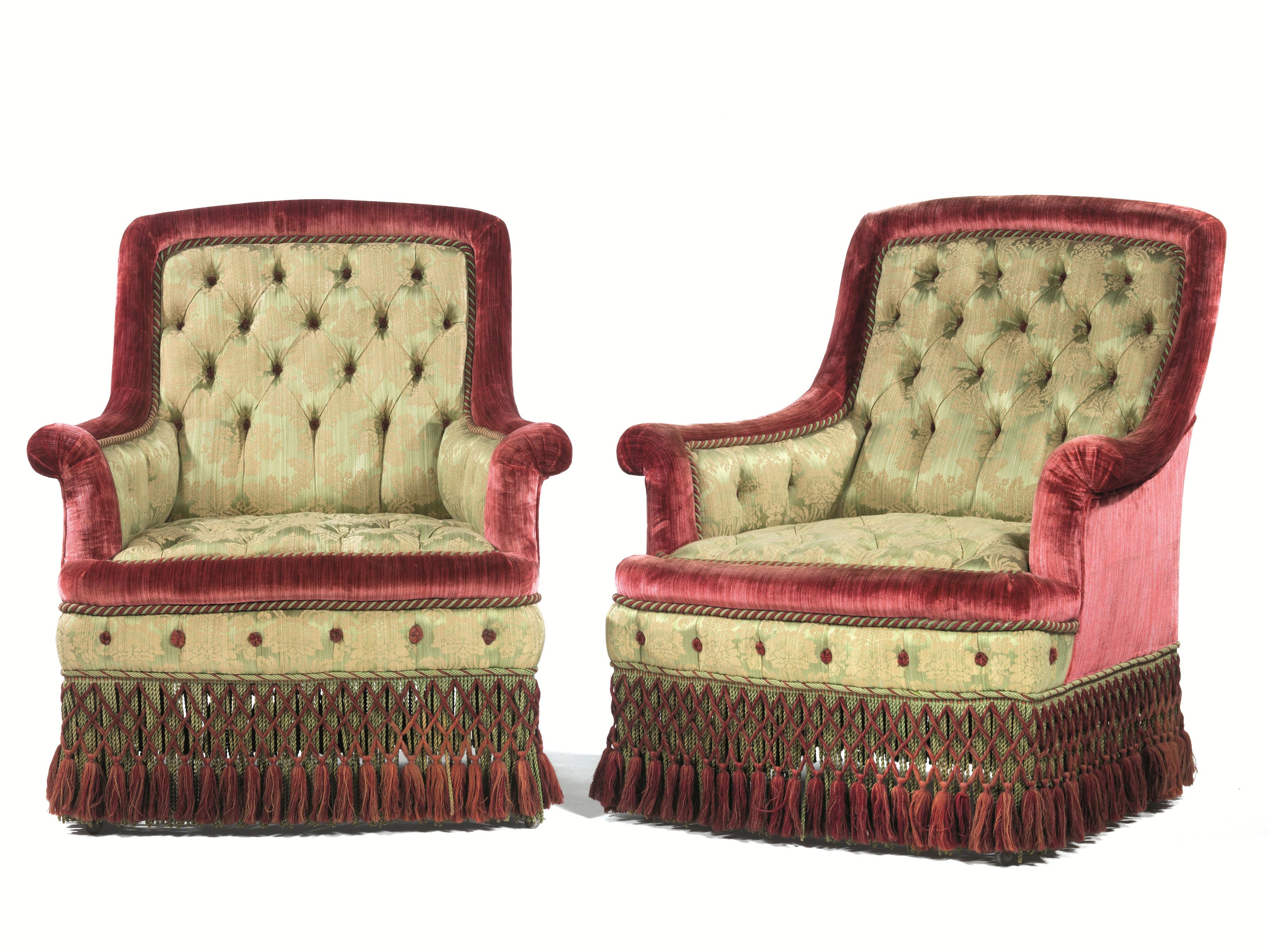 Coppia di poltrone, fine sec. XIX, ricoperte in seta verde-bordeaux,