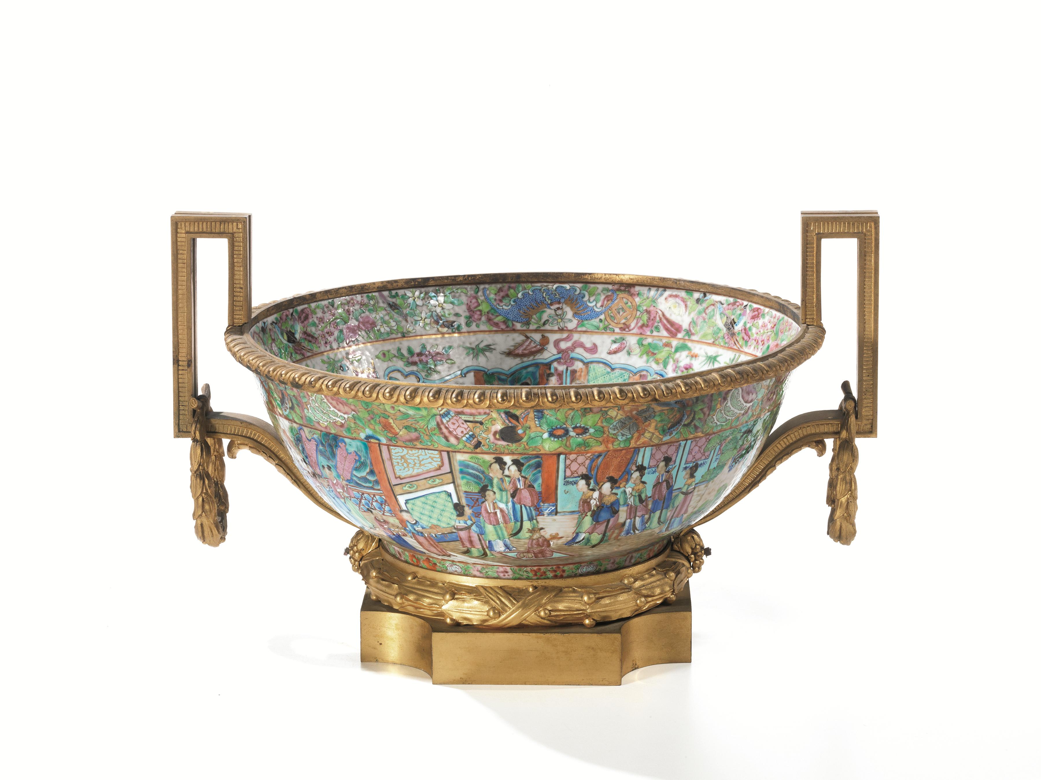 Coppa, sec. XIX, in porcellana orientale, con montatura in bronzo dorato,