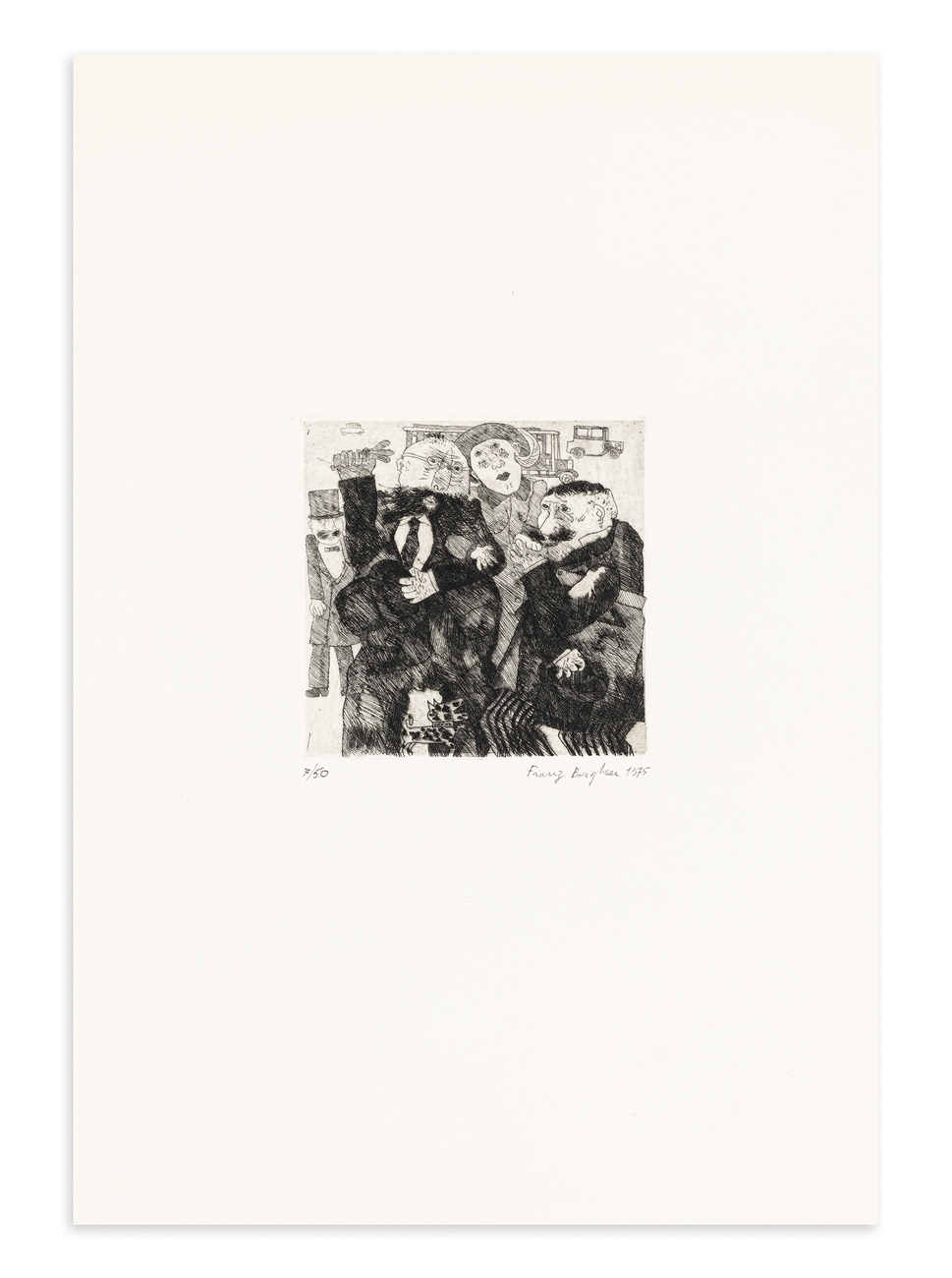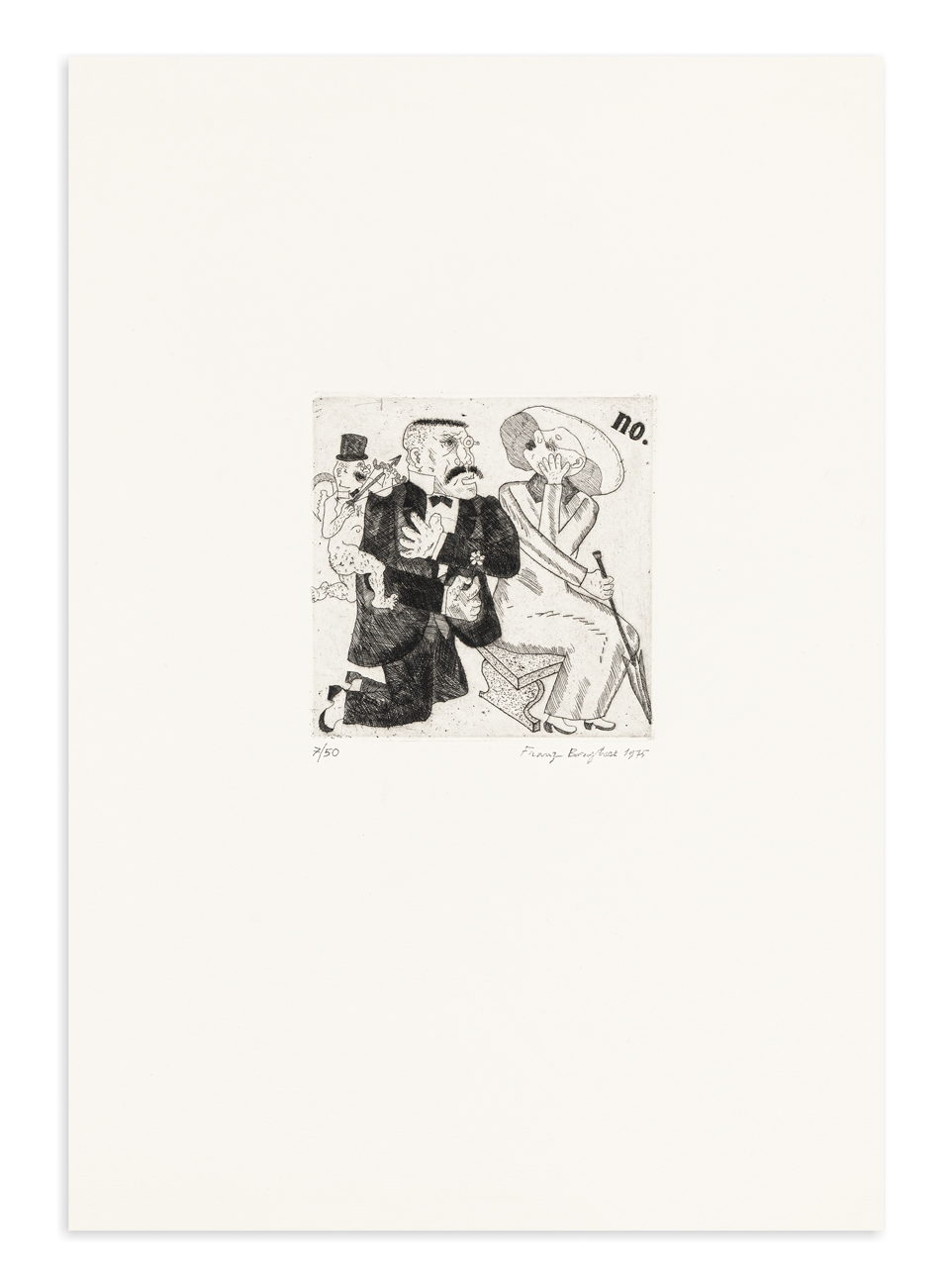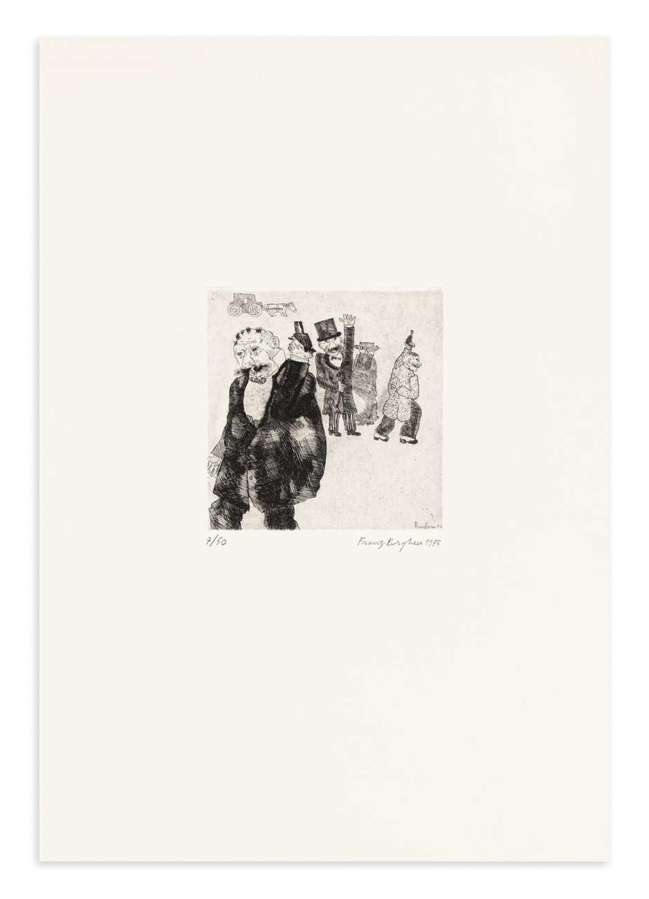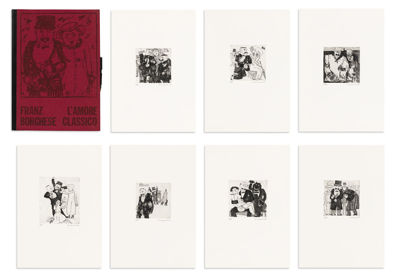 Cartella contenente introduzione e commenti di Ugo Moretti e 7 acqueforti di Franz Borghese, ciascuna recante firma, datazione e numerazione (Esemplari 7/50) a matita al fronte