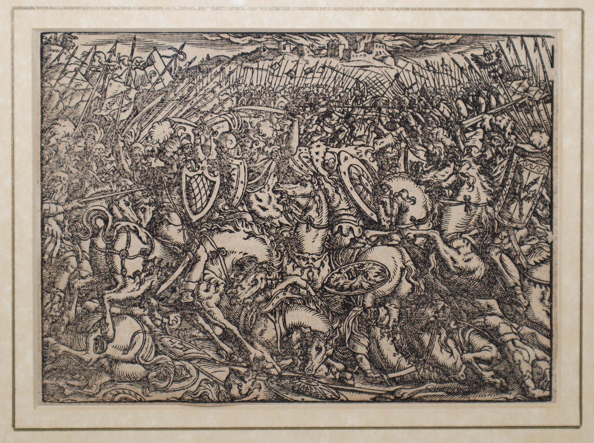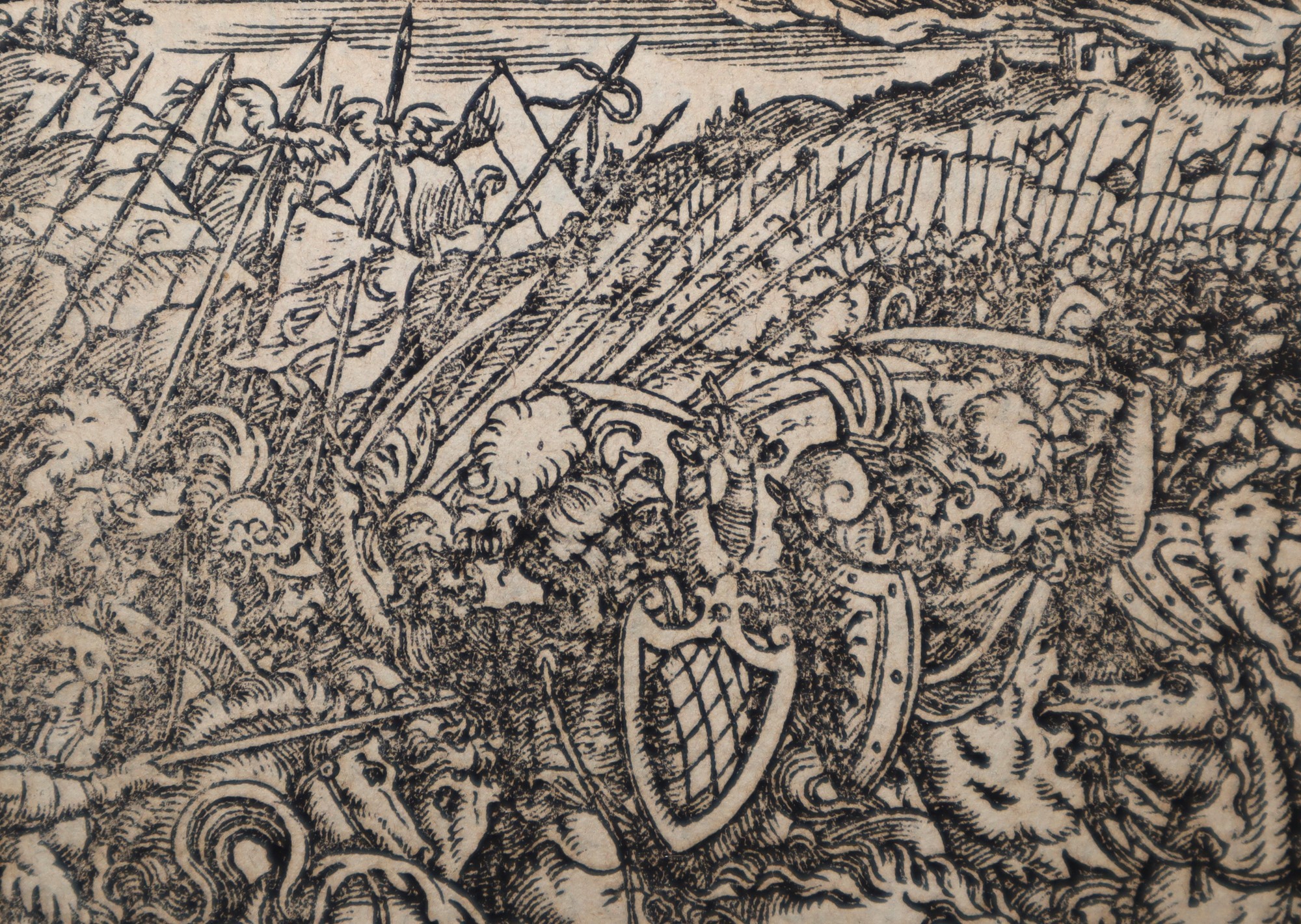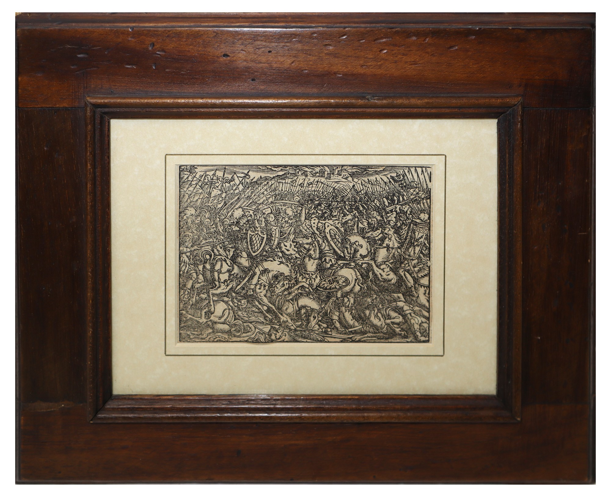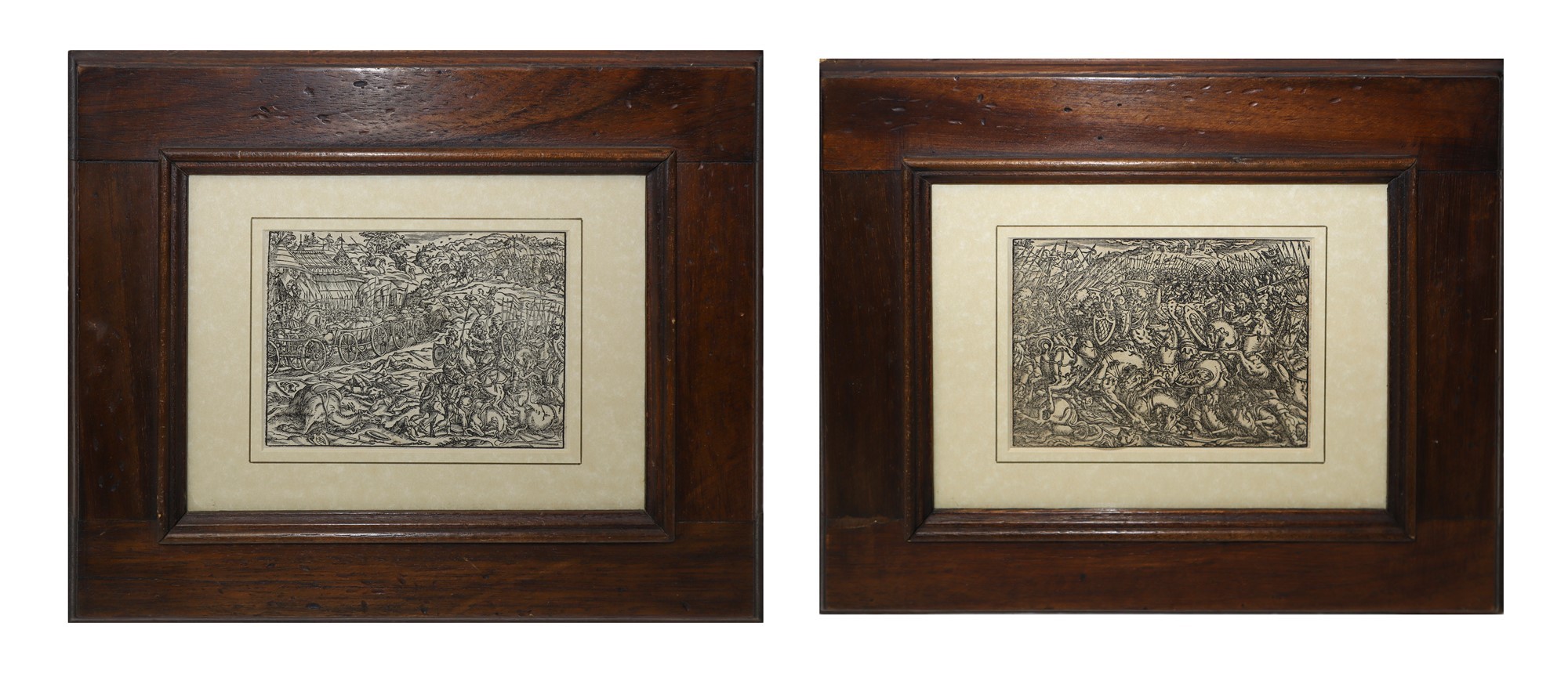 Jost Amman (Swiss 1539-1591) - Coppia di incisioni raffiguranti scene belliche, XVI secolo Incisione ad acquaforte