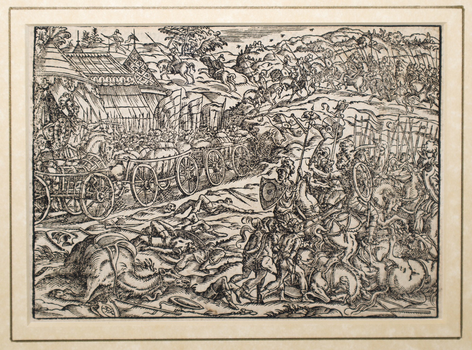 Jost Amman (Swiss 1539-1591) - Coppia di incisioni raffiguranti scene belliche, XVI secolo