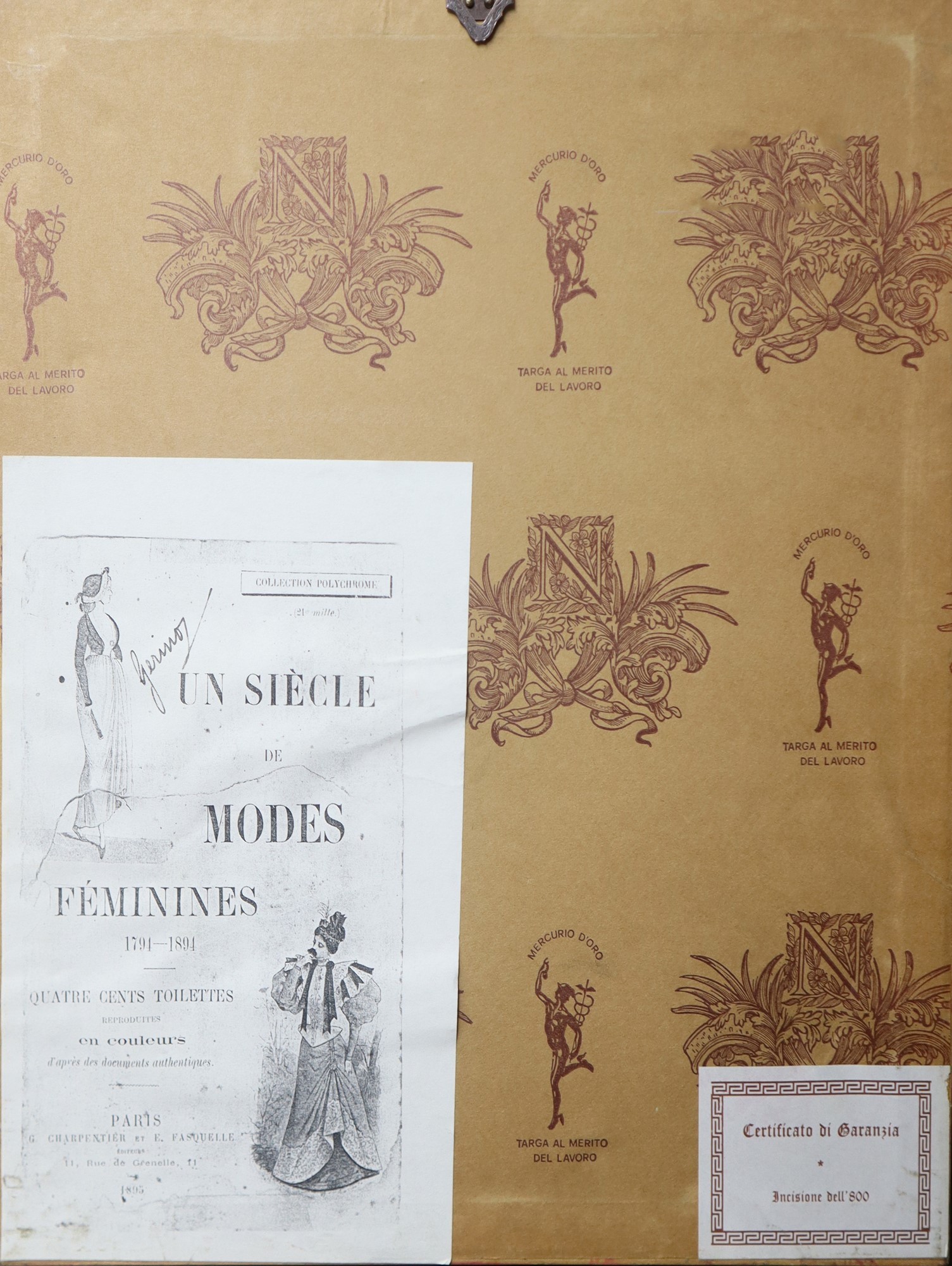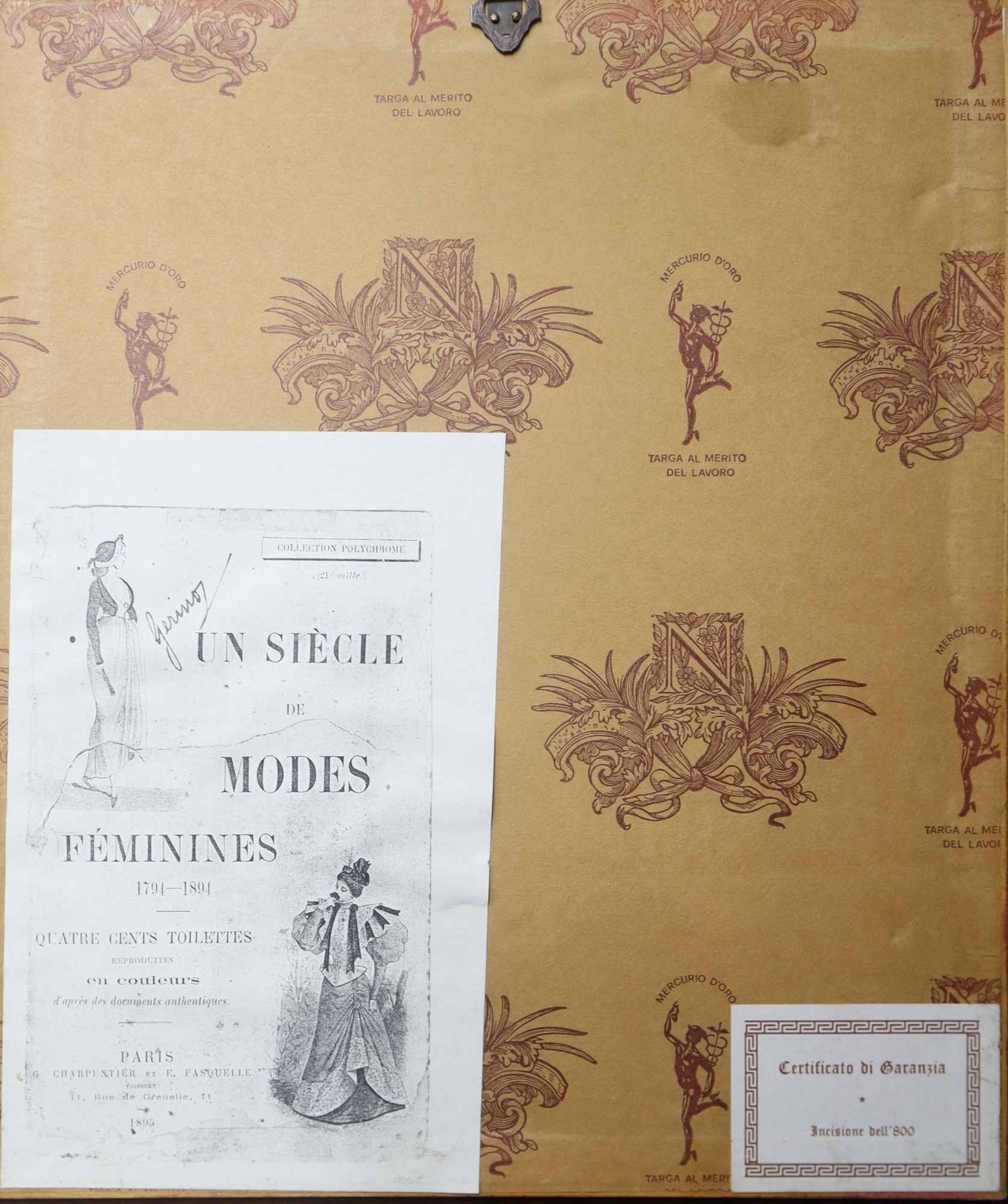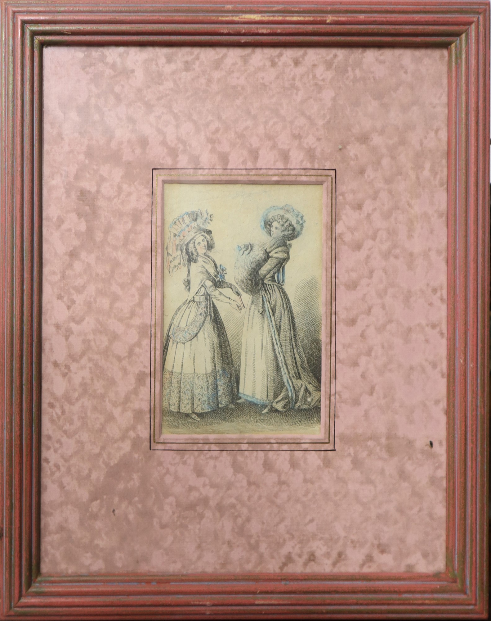 Coppia di stampe raffiguranti abiti femminili e costumi del tempo, 19° secolo cm 16,5 x cm 9; in cornice cm 34 x cm 23 Collezione policroma, Parigi, Rue de Grenelle 11, con certificato di garanzia dietro
