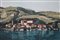 Paesaggio con case, colline e mare cm 34 x cm 53,5; in cornice cm 62 x cm 82 Litografia colorata Firmato in basso a destra.
