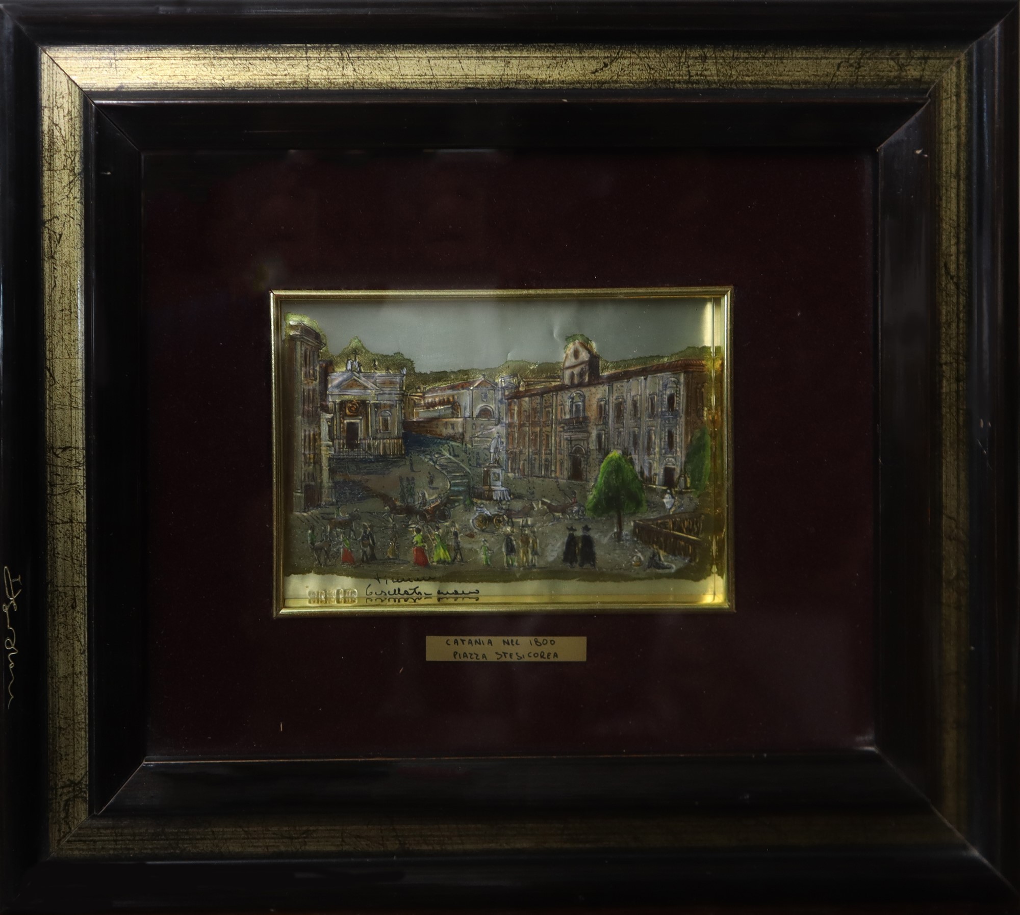 Piazza Stesicorea cm 9 x cm 13,5; in cornice h cm 26 x cm 30 cesello a mano su lastra d'argento Catania nel 1800