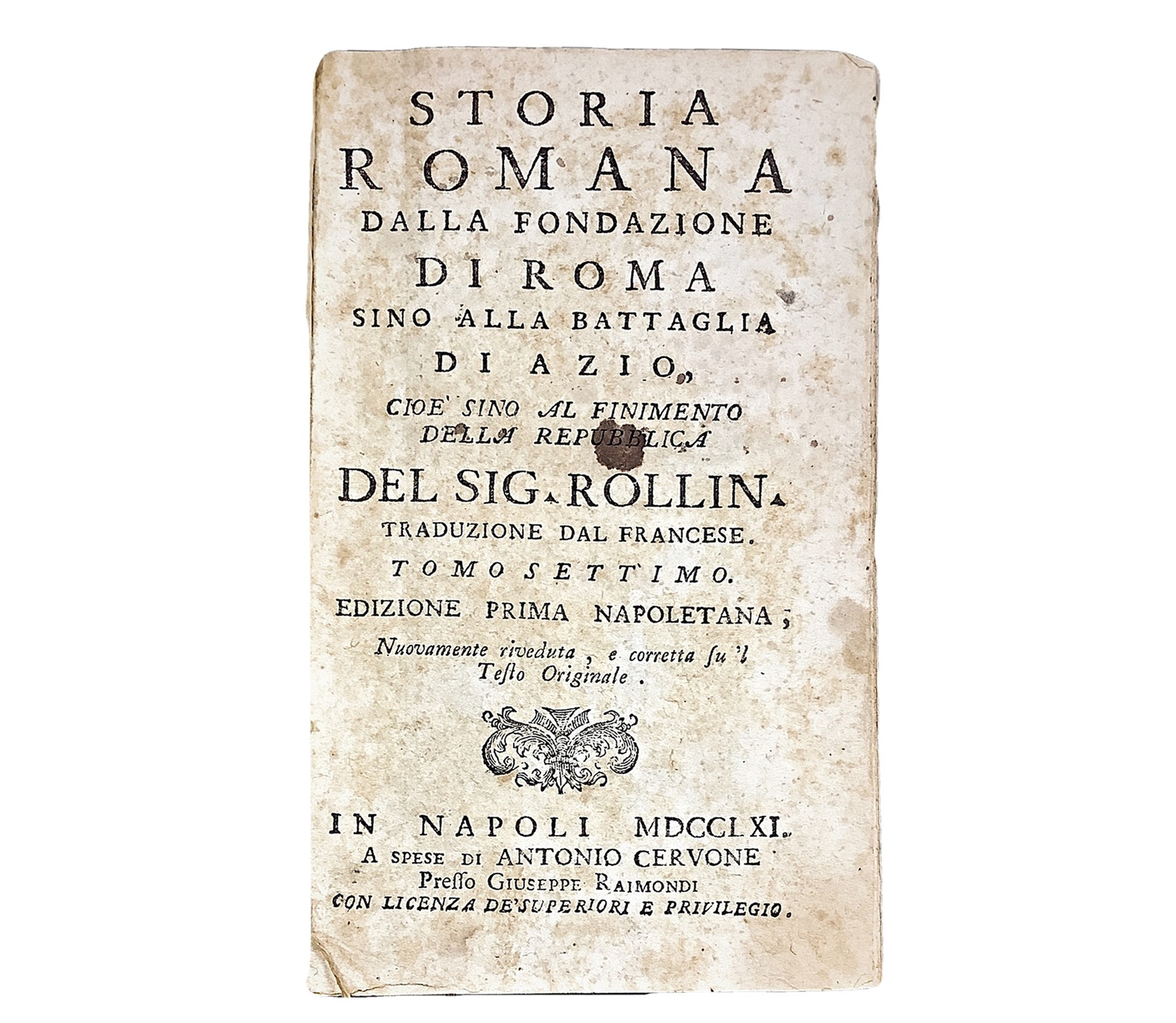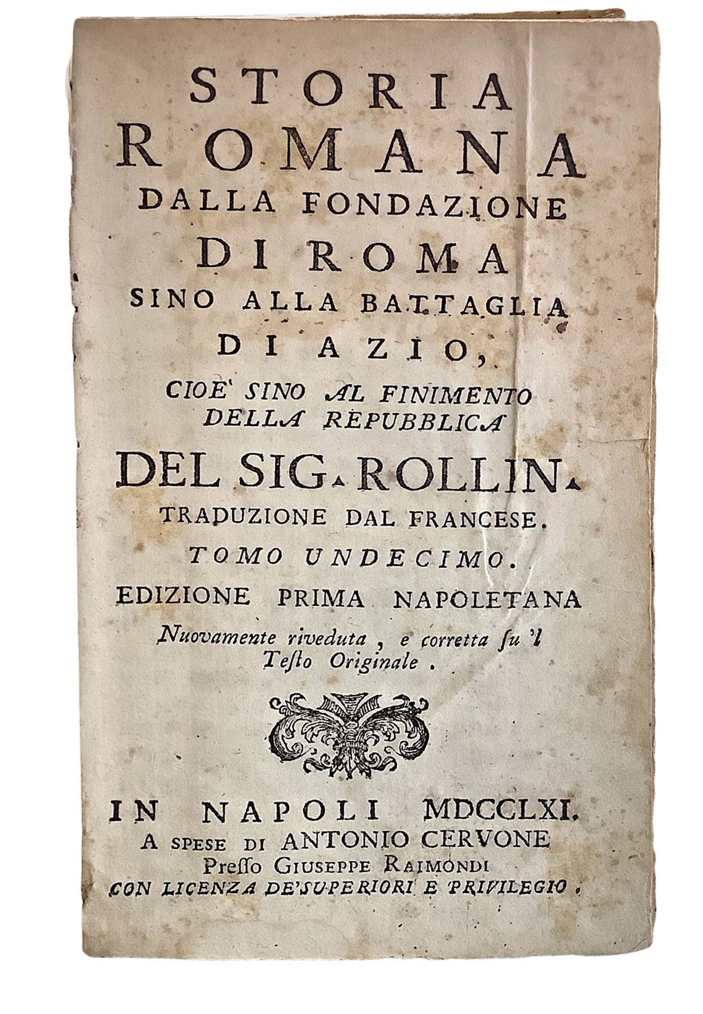 Storia romana, 1761 Dalla fondazione di Roma sino alla battaglia di Azio cioè sino al finimento della repubblica. Opera incompleta, presenti tomo settimo, undecimo, decimosettimo e decimottavo. Napoli, a spese di Antonio Cervone. Presenti sfilacciature e fioriture