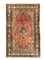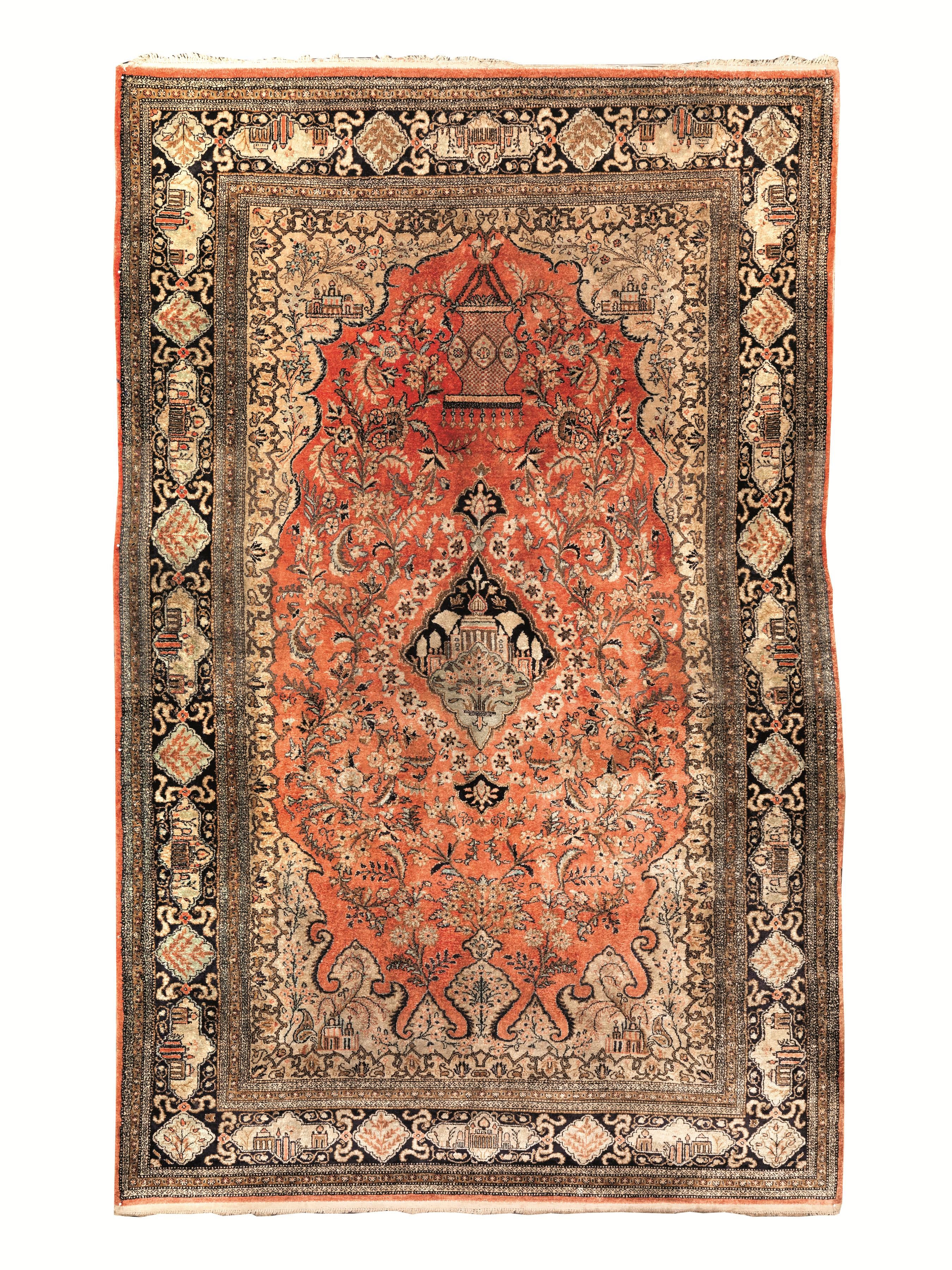 Tappeto persiano, Keshan, seconda metà sec. XX, in seta con campo centrato da riserva sagomata a fondo salmone, interamente decorato in policromia con ramage fioriti e al centro medaglione romboidale con moschea entro paesaggio, cm 212x135, danni