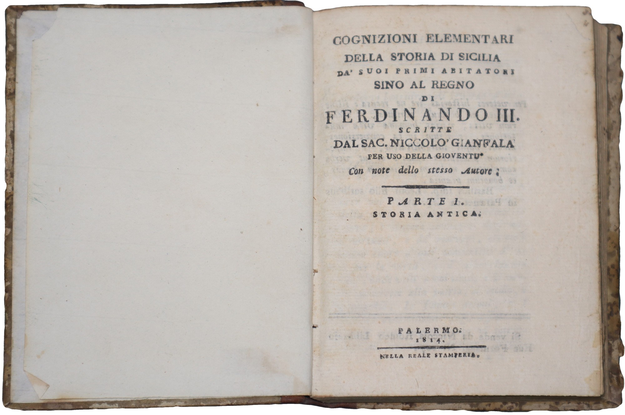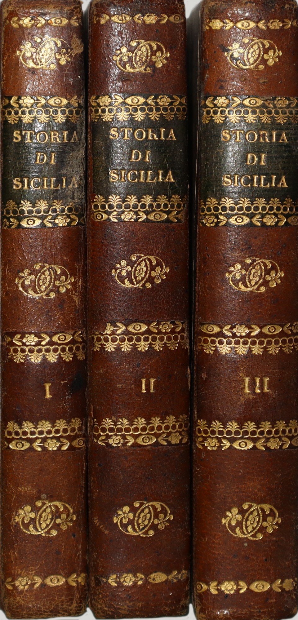 Niccolò Gianfala - Cognizioni elementari della storia di Sicilia, 1814 Da' suoi primi abitatori sino al regno di Ferdinando III, Volumi I-II-III, Palermo. Presenti fioriture