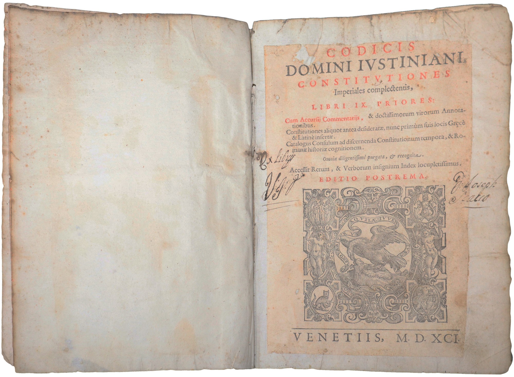Codicis Iustiniani Constitutiones, 1591 Imperiales complectentis, Libri IX. Priores, Edizio Porestrema, Venetiis. Presenti sfilacciature e fioriture
