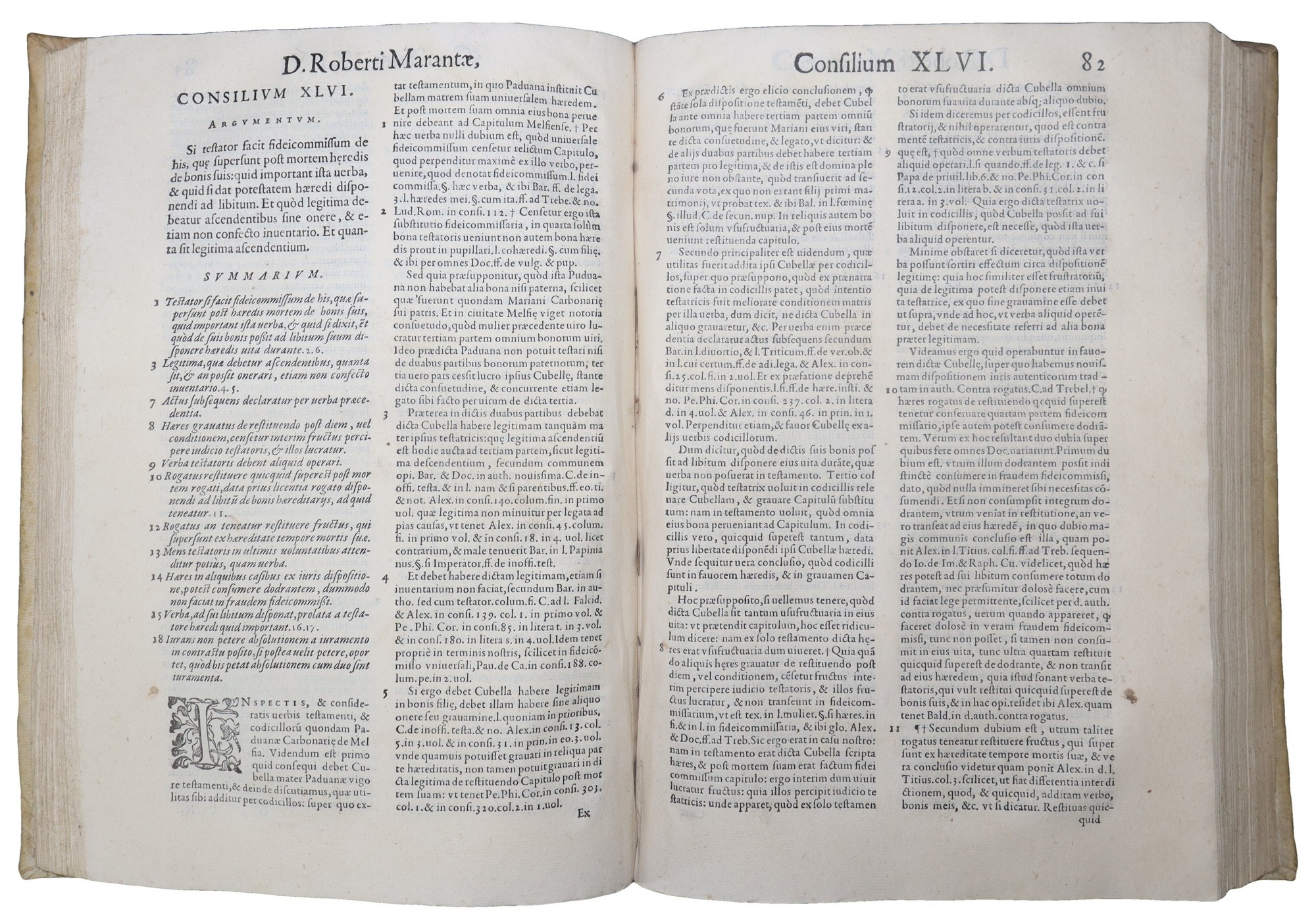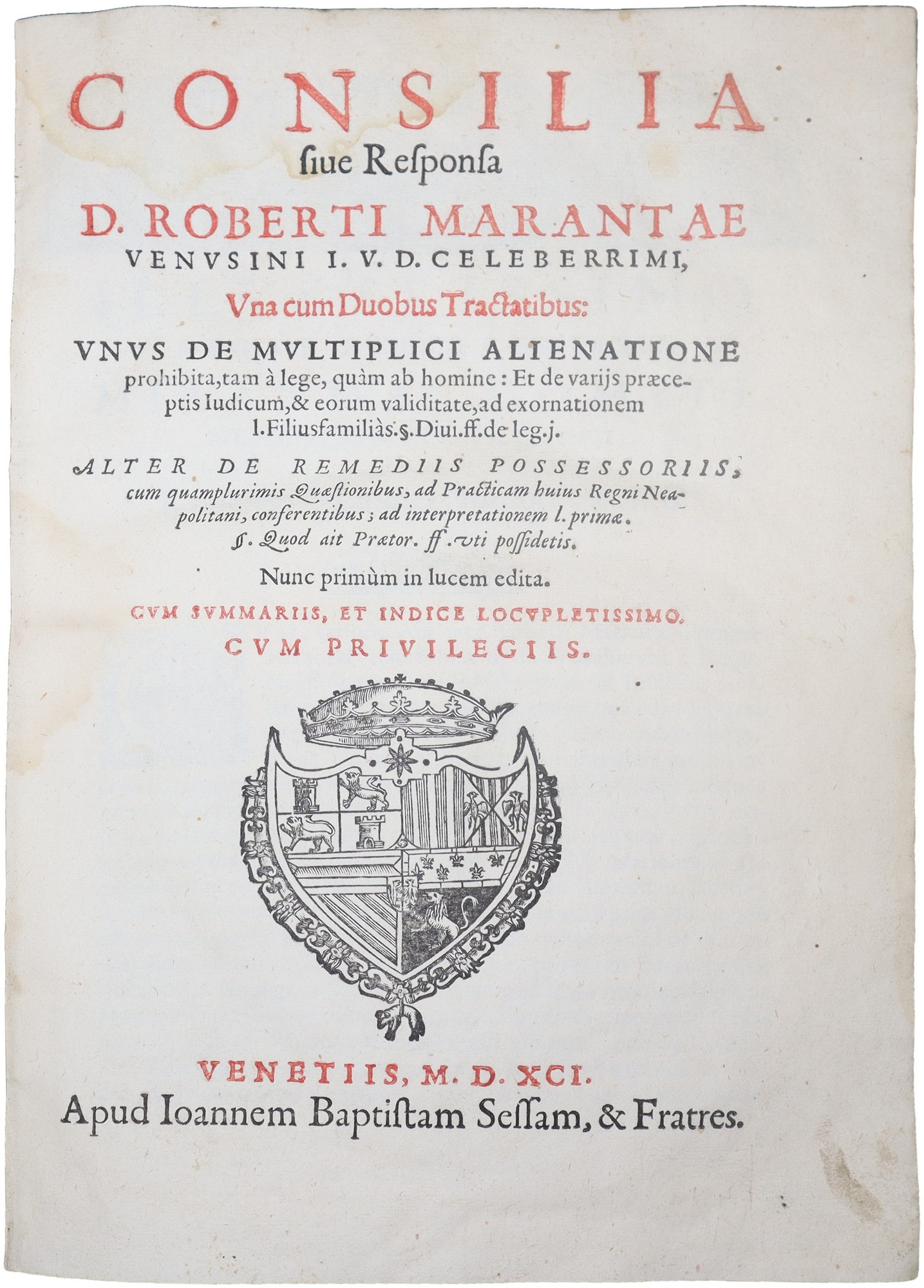 Roberto Maranta (Venosa 1476-Napoli 1535) - Consilia sive responsa, 1591 Una cum Duobus Tactatibus: unus de multiplici alienatione. Cum summariis, et indice locuplentissimo cum privilegis. Venetiis, apud Ioannem Baptistam Sessam, & Fratres. Presenti sfilacciature e fioriture