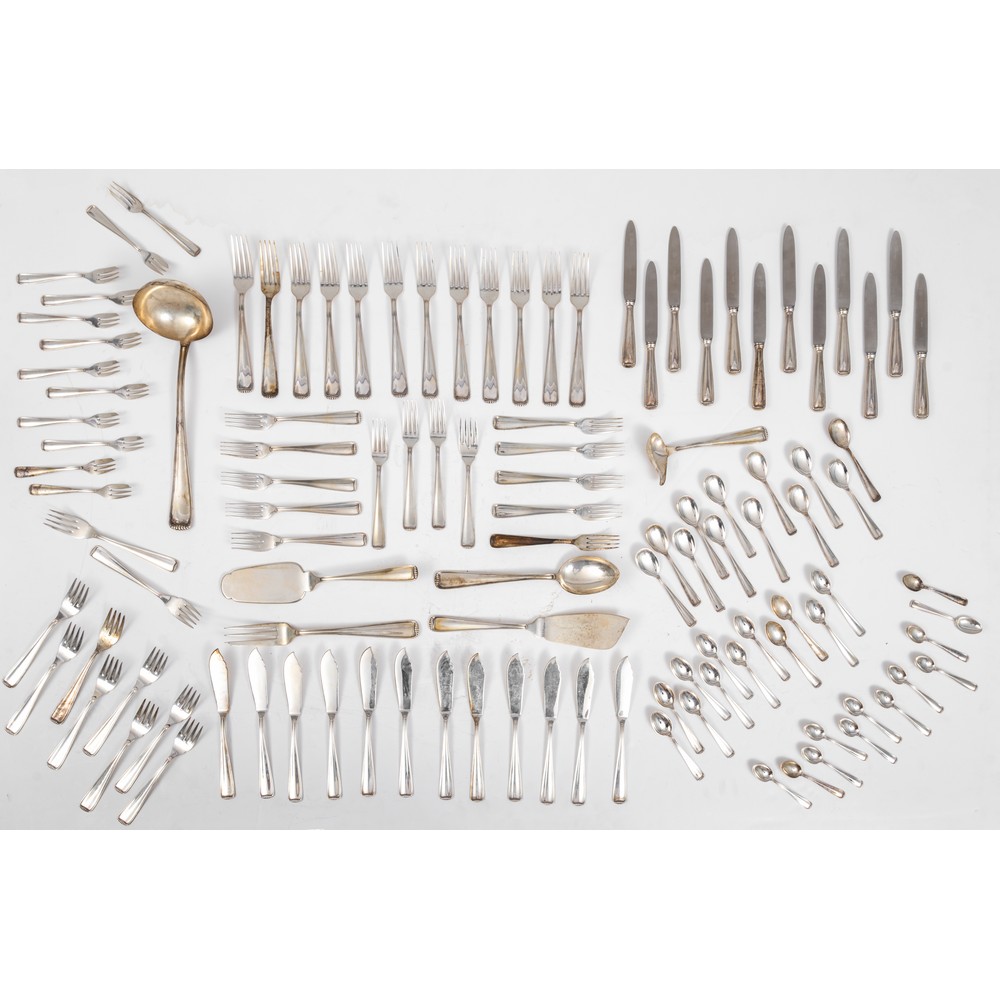 composto da: 12 forchette, 12 forchette pesce, 12 coltelli pesce, 12 forchette frutta, 12 coltelli frutta, 12 palettine gelato, 12 forchette dolci, 12 cucchiaini caffè, 12 cucchiaini the, mestolo, un mestolino da salsiera e 4 posate da portata. Argentiere Lupo Bernardo & figli - Palermo (g. 4500 esclusi coltelli)