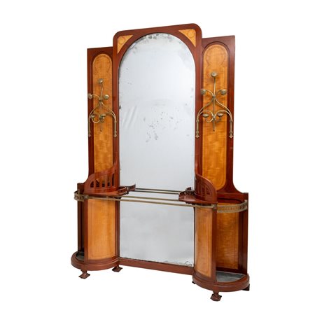 MOBILE da ingresso Liberty con porta abiti e porta ombrelli in legno di mogano e tarsie, con specchiera centrale.