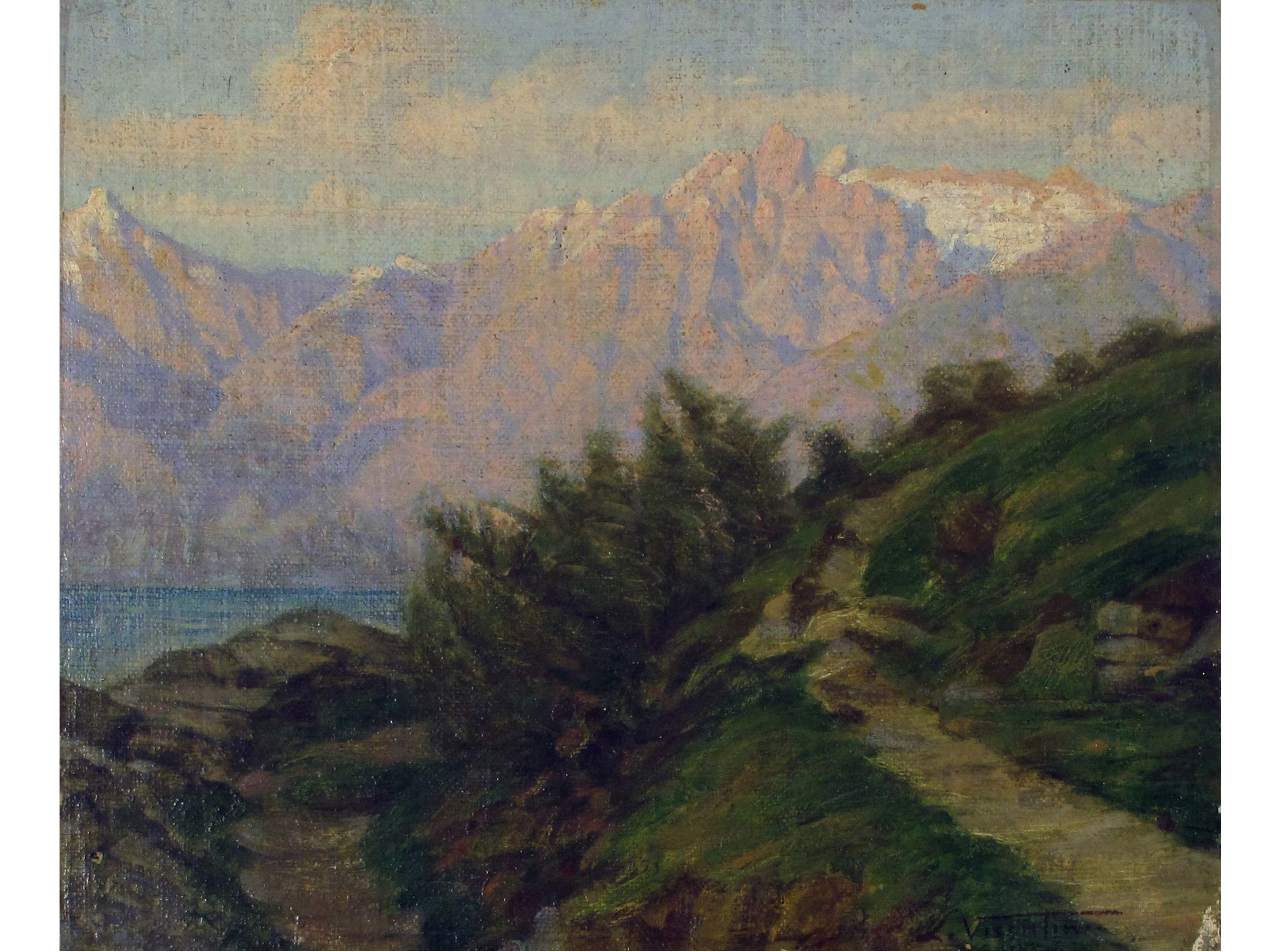 Visentini (XX sec) Paesaggio montano Olio su cartone telato Firmato Senza...