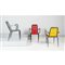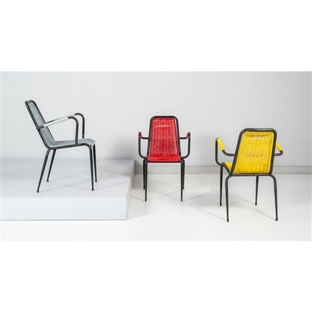 Tre poltrone in tondino metallico verniciato nero e rivestite con spaghetto plastico, una nei toni del celeste, una nei toni del rosso e una nei toni del giallo.