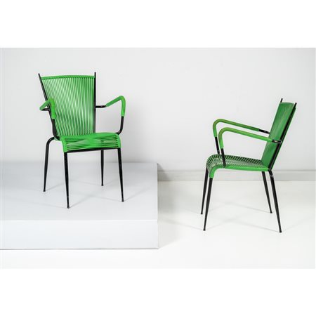 Due poltrone in tondino metallico verniciato nero e rivestite con spaghetto plastico nei toni del verde.