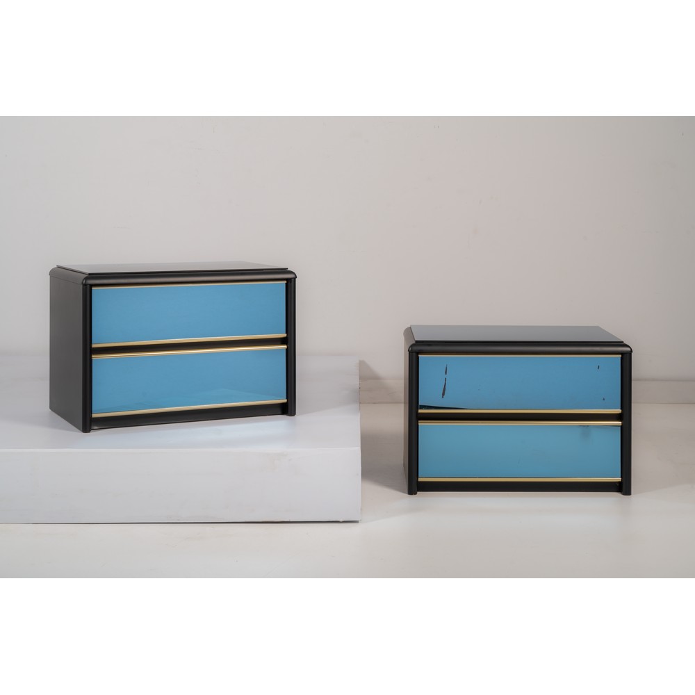 Coppia di comodini con struttura in legno laccato nero, piano rettangolare, sul fronte due cassetti rivestiti con specchi blu e metallo dorato.