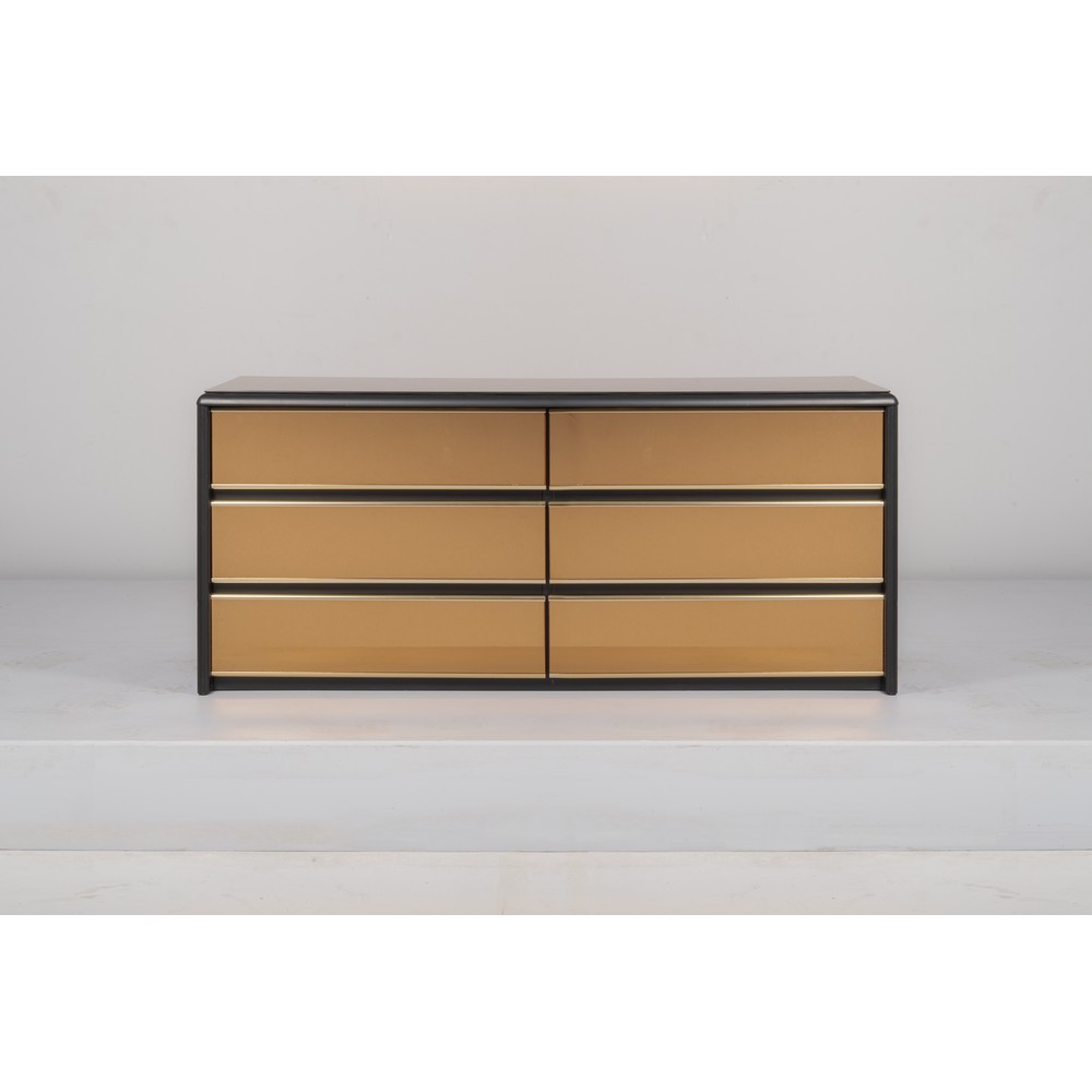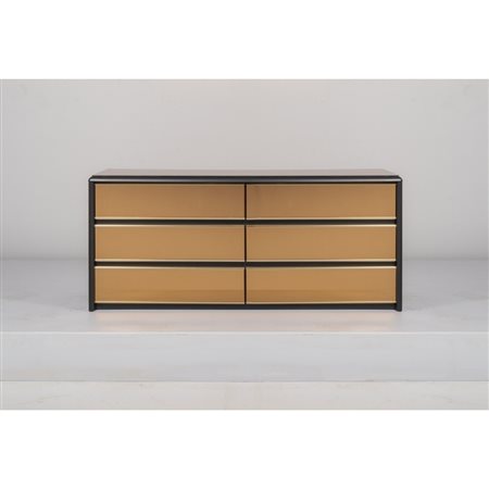 Cassettiera con struttura in legno laccato nero, piano rettangolare, sul fronte sei cassetti rivestiti con specchi dorati e metallo dorato.