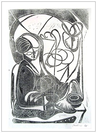 GIANNI BERTINI Pisa 1922 – Caen (Francia) 2010 Senza titolo 1948 Linoleumgrafia es.épreuve d'artiste. Firma e data in b. a d.; firma, tecnica e scritta di esemplare in b. al c. sul passepartout della cartellina. (50 x 31,5 foglio – 36 x 25 lin.)