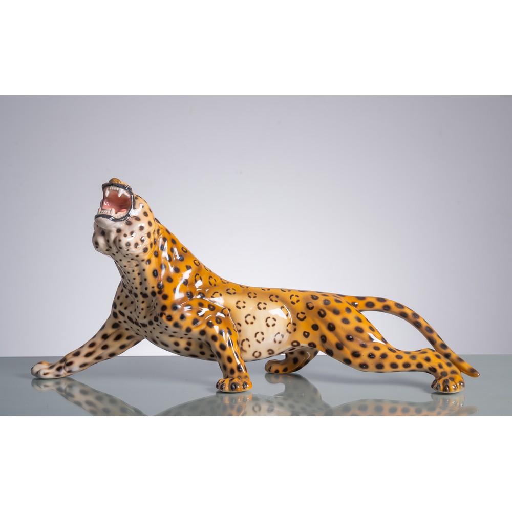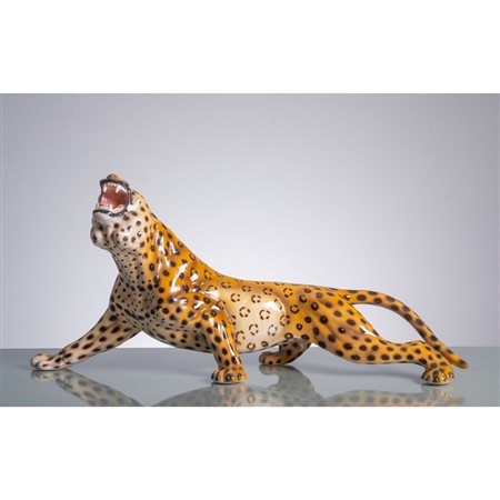 Scultura in ceramica decorata raffigurante un leopardo, firma alla base.