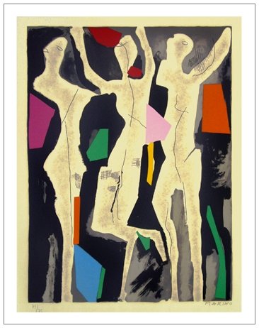 MARINO MARINI Pistoia 1901 – Viareggio 1980 Personagges du Sacre du Printemps – tav.V 1974 Litografia a 10 colori es.71/75. Firma in b. a d. (65 x 50 foglio – 52 x 39,5 lito.) L’opera fa parte dell’omonima cartella di 8 litografie. Tiratura: 3 es. nominativi + X es. num. romani su carta Japon Nacré + 75 es. num. arabi su carta Arches + XXXV es. num. romani fuori commercio. Pubbl.: “Marino Marini Catalogo Ragionato dell’Opera Grafica (incisioni e litografie) 1919 – 1980)” a cura di Giorgio e Guido Guastalla, Livorno, 1990, Editore Graphis Arte, Livorno, p.175, L 118 + p.244, L 118.