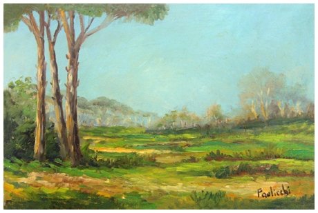 EURO PAOLICCHI Pisa 1926 Pineta Olio su faesite 20 x 30. Firma in b. a d.;...