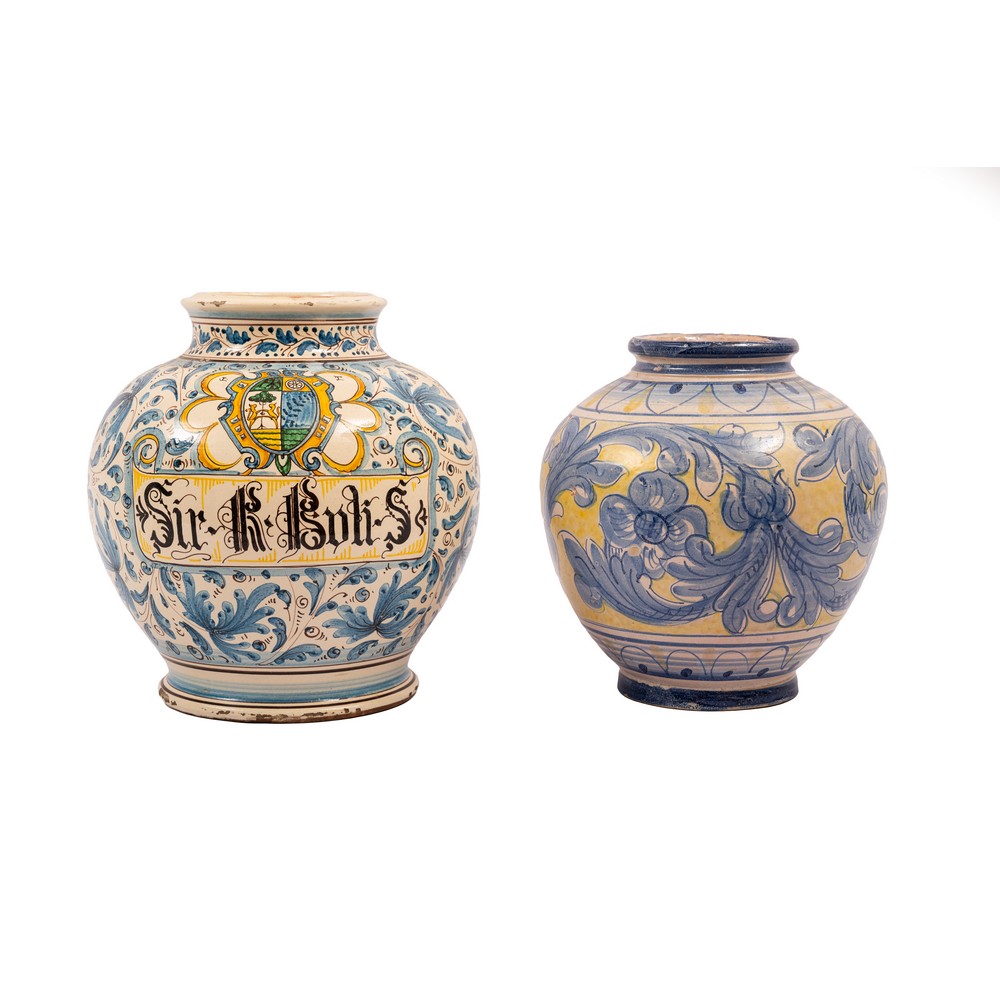 DUE BOCCE in ceramica decorata e smaltata, con medaglione centrale e stemma nobiliare.