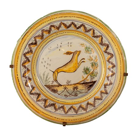 GRANDE FANGOTTO in ceramica decorata e smaltata, con decori a motivo vegetale e animale.