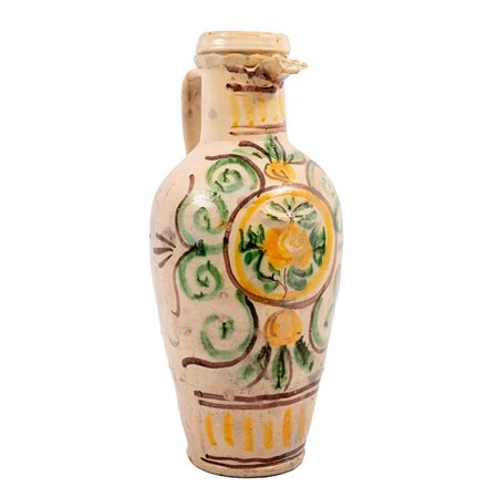 QUARTARA in ceramica decorata e smaltata (manico mancante, difetti e usure).
