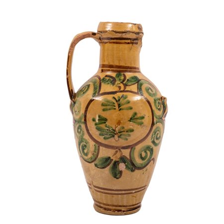 QUARTARA in ceramica decorata e smaltata (usure e manico mancante).