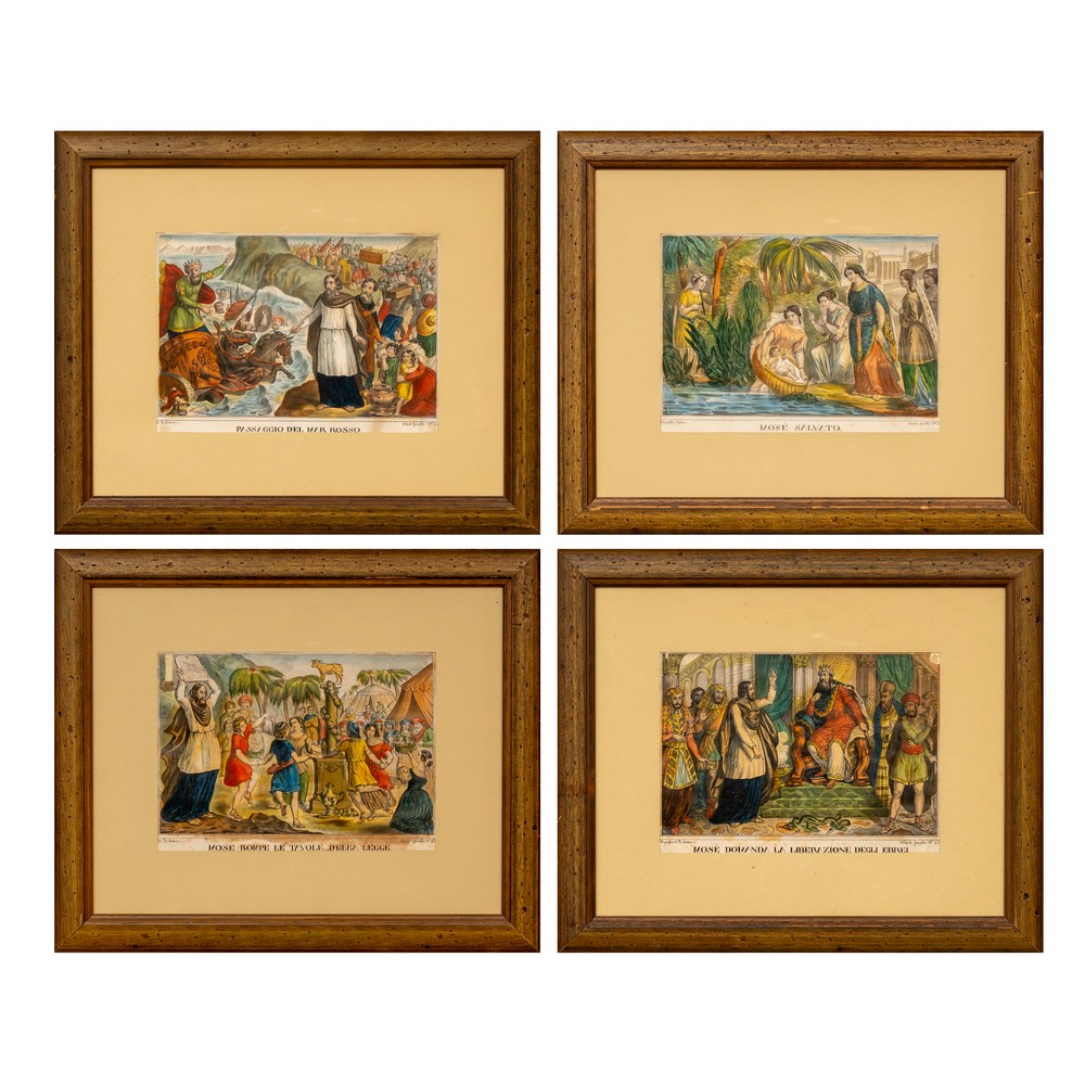 QUATTRO STAMPE colorate raffiguranti "Storie di vita di Mosè".