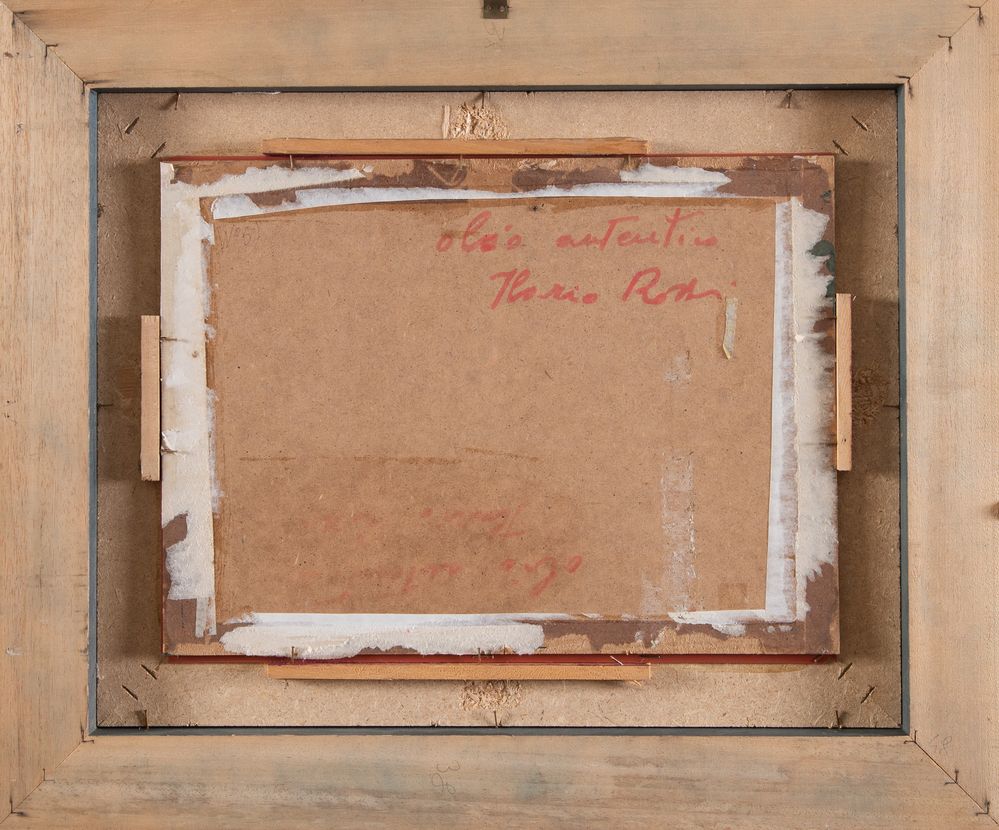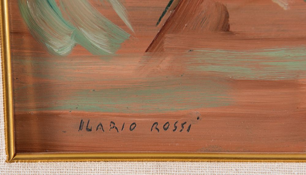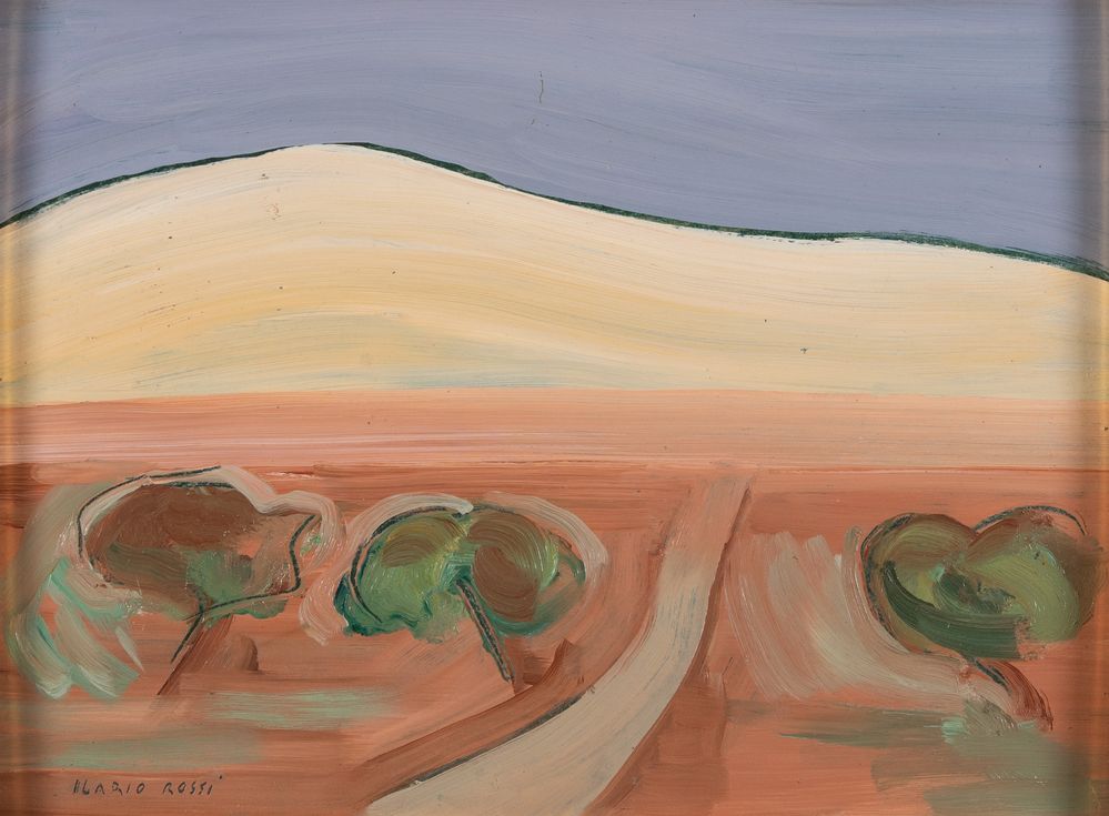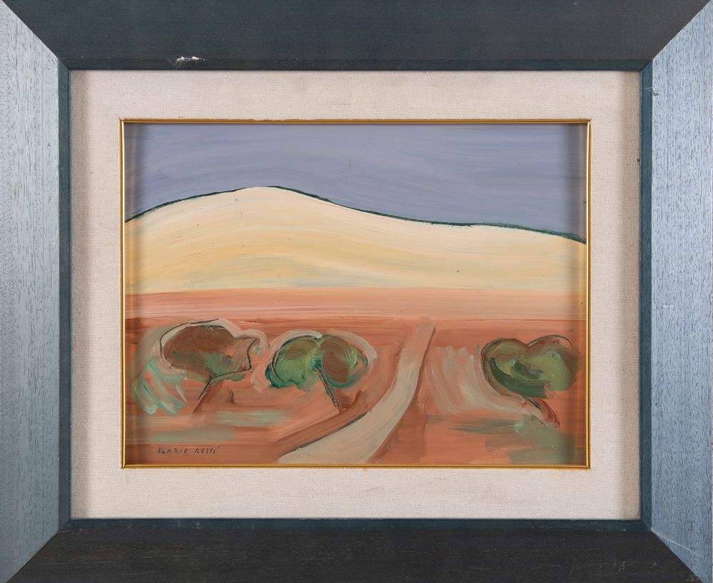 ILARIO ROSSI (Bologna 1911 - 1994) "Paesaggio", anni ’90. Acrilico su faesite. Cm 29,3x40,5. Opera firmata in basso a sinistra Ilario Rossi. Al retro reca scritta olio autentico Ilario Rossi.