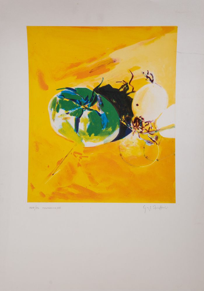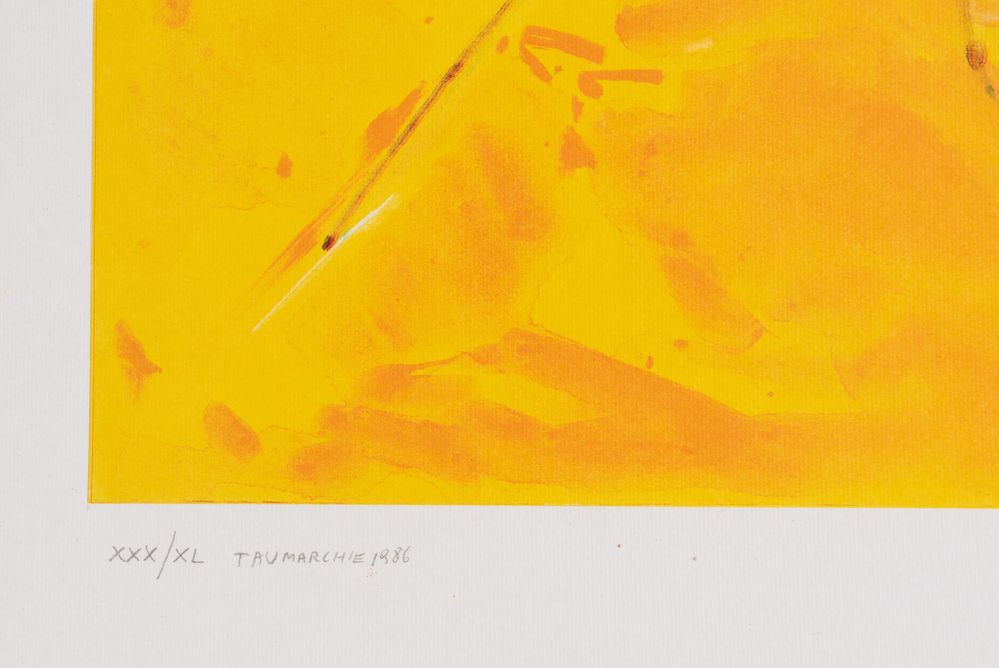 Pittore anonimo del XX secolo. "Taumarchie",1986. Litografia a colori su carta. Lastra: cm 30x25; foglio: cm 50x35. Opera firmata in basso a destra. Reca numeri di tiratura, titolo e data in basso a sinistra XXX/XL, Taumarchie, 1986.