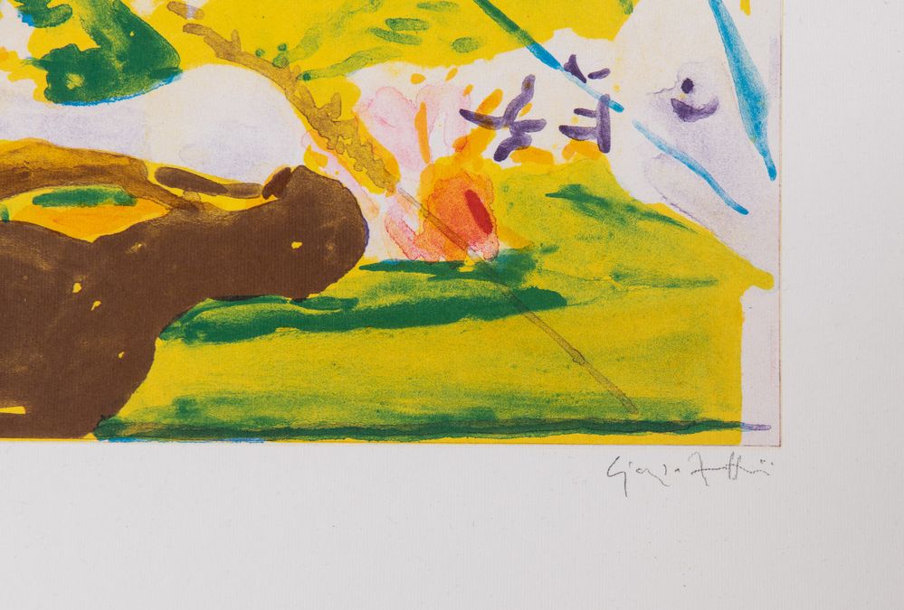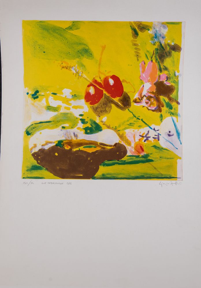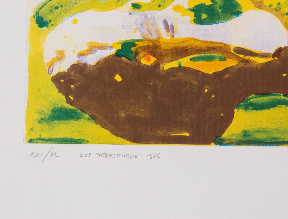 Pittore anonimo del XX secolo. "Due Paterlenghe",1986. Litografia a colori su carta. Lastra: cm 27,5x27,5; foglio: cm 50x35. Opera firmata in basso a destra. Reca numeri di tiratura, titolo e data in basso a sinistra XXXI/XL, Due Paterlenghe, 1986.