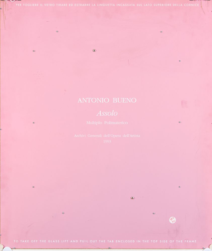 ANTONIO BUENO (Berlino 1918 - Fiesole 1984) "Assolo", 1993. Multiplo polimaterico realizzato su prototipo dell'artista del 1970. Opera: 49,2x39,4; cornice: cm 70x60. Reca firma, in calco, in alto a destra A. Bueno. Al retro reca scritta Archivi Generali dell'Opera dell'Artista, con titolo e data. Opera accompagnata da certificato di autenticità degli Archivi Generali dell'Opera dell'Artista, con firma Giovanbattista Bianco. Esemplare LXXV/LXXV.
