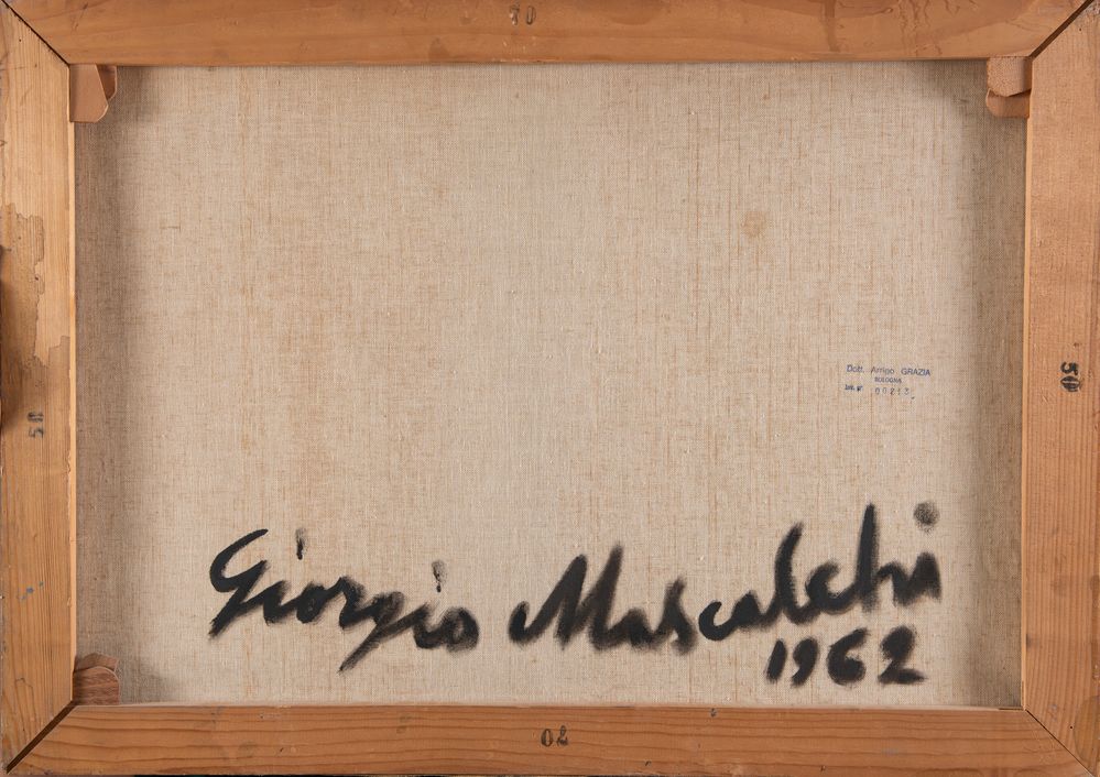 GIORGIO MASCALCHI (Bologna 1935 - Forlì 2010) "Senza titolo", 1962. Olio su tela. Cm 50,5x70,5. Opera firmata e datata in basso a destra Giorgio Mascalchi. Al retro opera firmata e datata Giorgio Mascalchi 1962.