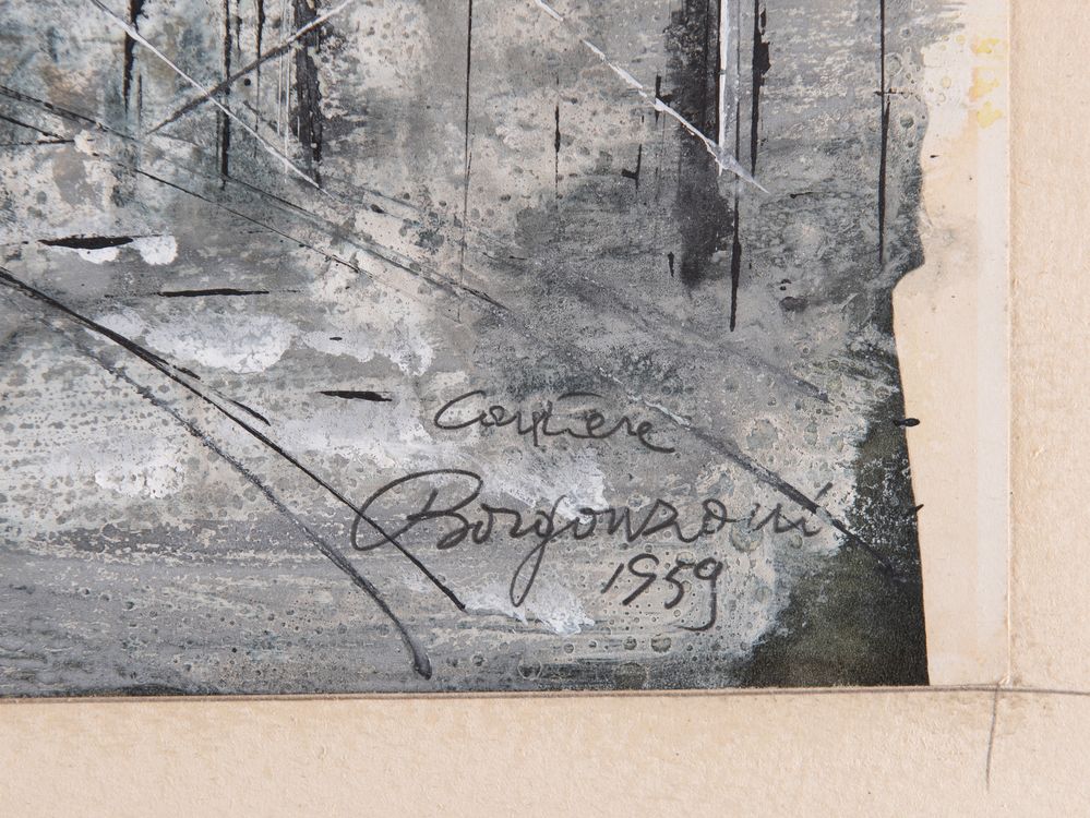 ALDO BORGONZONI (Medicina 1913 - Bologna 2004) "Cantiere", 1959. Tecnica mista su carta applicato su cartone. Cm 36,6x52. Opera intitolata, firmata e datata in basso a destra Cantiere Borgonzoni 1959. Al retro reca scritta.